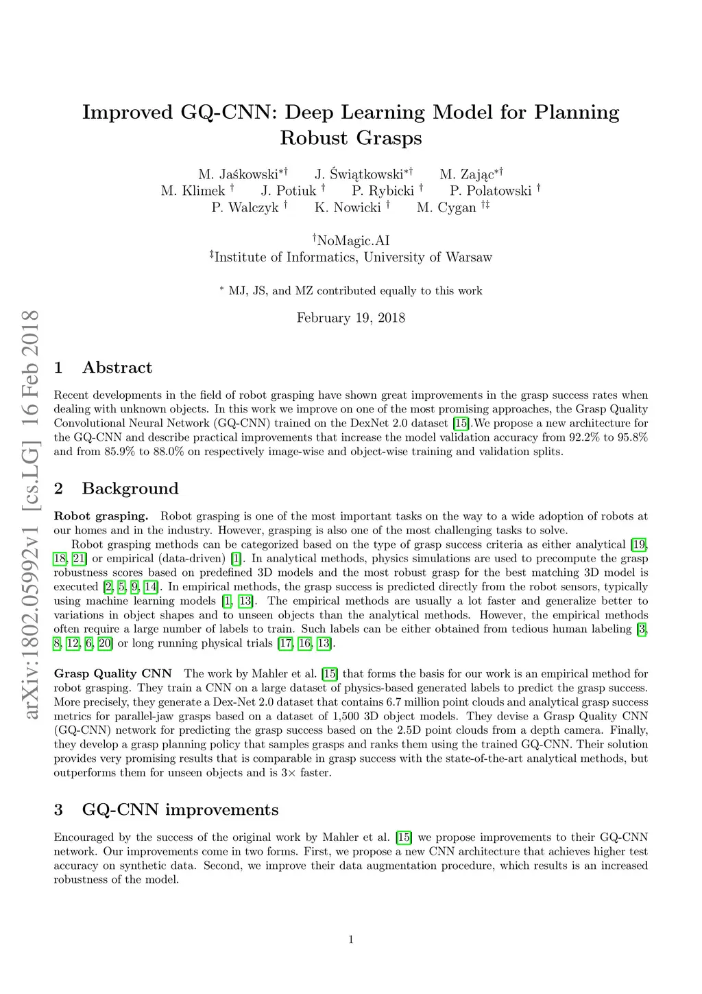 Improved GQ-CNN: Deep Learning Model for Planning Robust Grasps