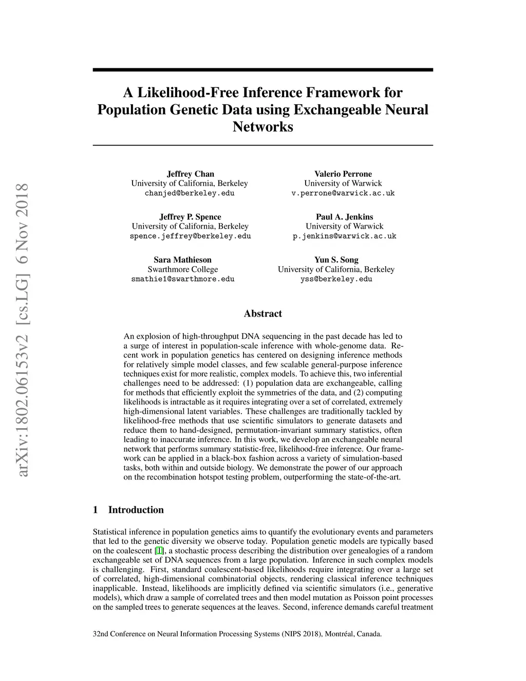 Inference for population genetics models is hindered by computationally intractable likelihoods. While this issue is tackled by likelihood-free methods, these approaches typically rely on hand-crafted summary statistics of the data. In complex settings, designing and selecting suitable summary statistics is problematic and results are very sensitive to such choices. In this paper, we learn the first exchangeable feature representation for population genetic data to work directly with genotype data. This is achieved by means of a novel Bayesian likelihood-free inference framework, where a permutation-invariant convolutional neural network learns the inverse functional relationship from the data to the posterior. We leverage access to scientific simulators to learn such likelihood-free function mappings, and establish a general framework for inference in a variety of simulation-based tasks. We demonstrate the power of our method on the recombination hotspot testing problem, outperforming the state-of-the-art.