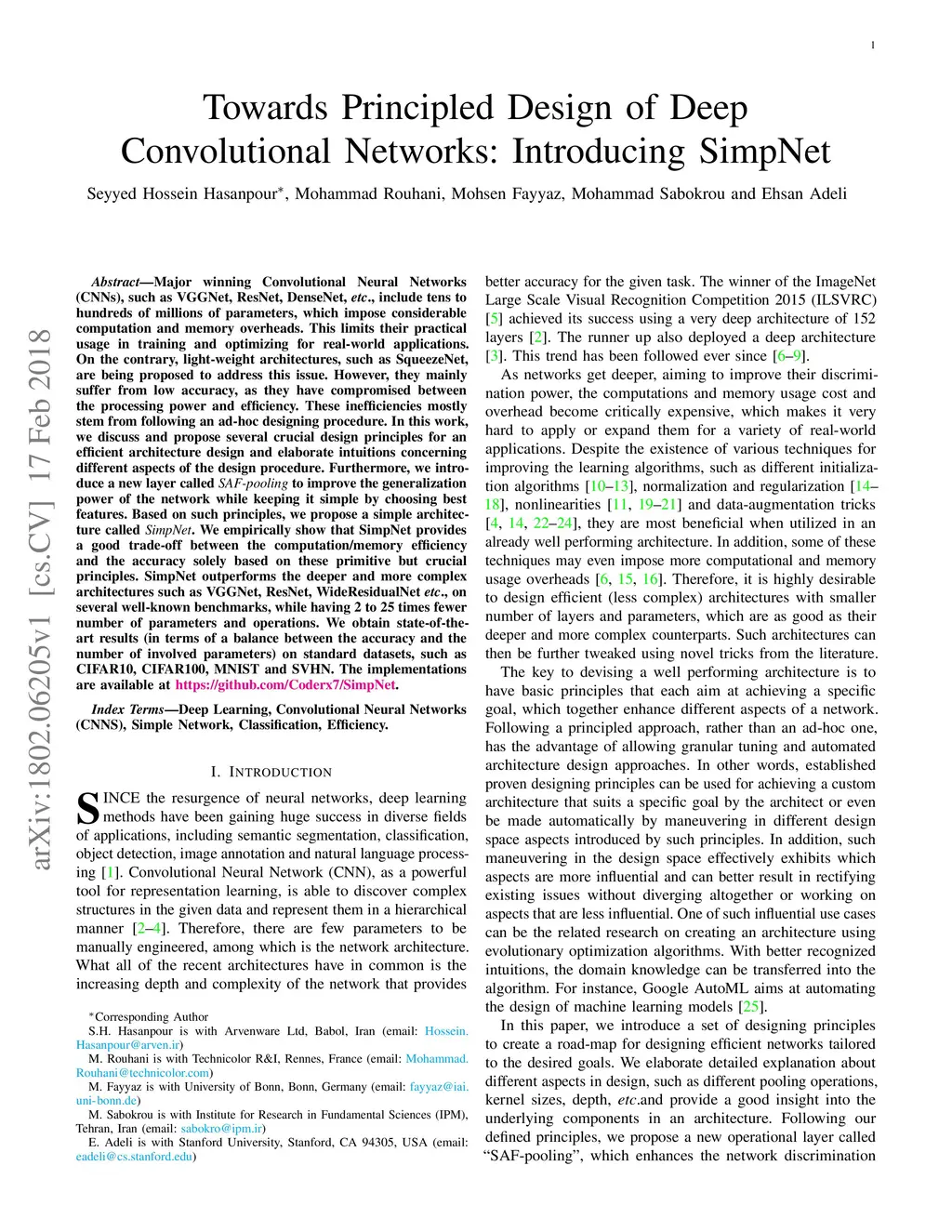 Major winning Convolutional Neural Networks (CNNs), such as VGGNet, ResNet, DenseNet, \etc, include tens to hundreds of millions of parameters, which impose considerable computation and memory overheads. This limits their practical usage in training and optimizing for real-world applications. On the contrary, light-weight architectures, such as SqueezeNet, are being proposed to address this issue. However, they mainly suffer from low accuracy, as they have compromised between the processing power and efficiency. These inefficiencies mostly stem from following an ad-hoc designing procedure. In this work, we discuss and propose several crucial design principles for an efficient architecture design and elaborate intuitions concerning different aspects of the design procedure. Furthermore, we introduce a new layer called {\it SAF-pooling} to improve the generalization power of the network while keeping it simple by choosing best features. Based on such principles, we propose a simple architecture called {\it SimpNet}. We empirically show that SimpNet provides a good trade-off between the computation/memory efficiency and the accuracy solely based on these primitive but crucial principles. SimpNet outperforms the deeper and more complex architectures such as VGGNet, ResNet, WideResidualNet \etc, on several well-known benchmarks, while having 2 to 25 times fewer number of parameters and operations. We obtain state-of-the-art results (in terms of a balance between the accuracy and the number of involved parameters) on standard datasets, such as CIFAR10, CIFAR100, MNIST and SVHN. The implementations are available at \href{url}{https://github.com/Coderx7/SimpNet}.