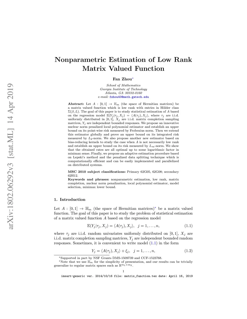 Let (the space of Hermitian matrices) be a matrix valued function which is low rank with entries in H\"{o}lder class . The goal of this paper is to study statistical estimation of based on the regression model where are i.i.d. uniformly distributed in , are i.i.d. matrix completion sampling matrices, are independent bounded responses. We propose an innovative nuclear norm penalized local polynomial estimator and establish an upper bound on its point-wise risk measured by Frobenius norm. Then we extend this estimator globally and prove an upper bound on its integrated risk measured by -norm. We also propose another new estimator based on bias-reducing kernels to study the case when is not necessarily low rank and establish an upper bound on its risk measured by -norm. We show that the obtained rates are all optimal up to some logarithmic factor in minimax sense. Finally, we propose an adaptive estimation procedure based on Lepskii's method and model selection with data splitting which is computationally efficient and can be easily implemented and parallelized.