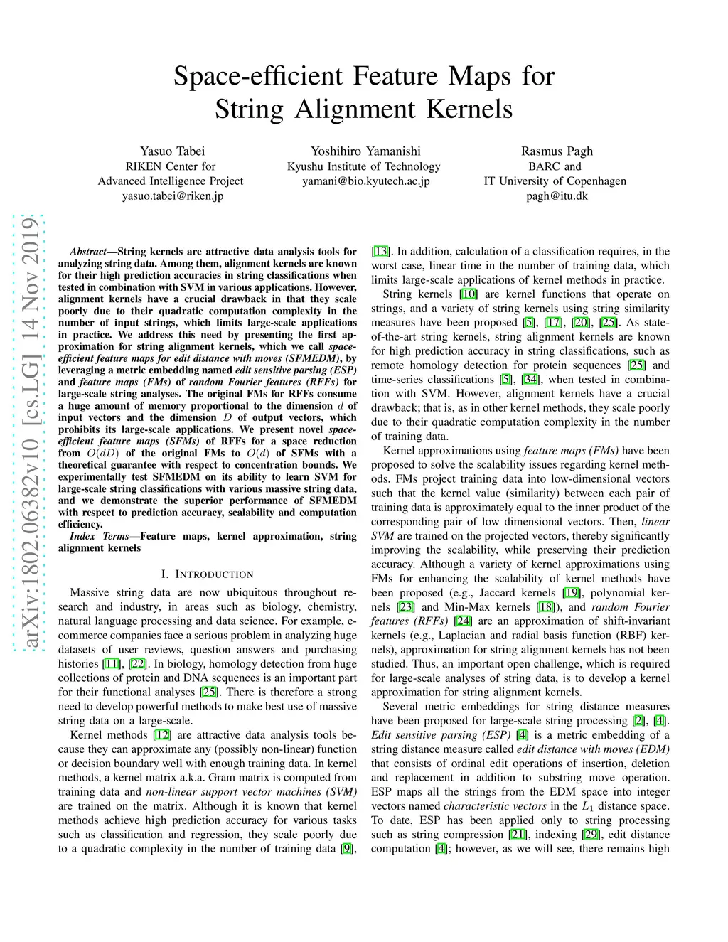String kernels are attractive data analysis tools for analyzing string data. Among them, alignment kernels are known for their high prediction accuracies in string classifications when tested in combination with SVM in various applications. However, alignment kernels have a crucial drawback in that they scale poorly due to their quadratic computation complexity in the number of input strings, which limits large-scale applications in practice. We address this need by presenting the first approximation for string alignment kernels, which we call space-efficient feature maps for edit distance with moves (SFMEDM), by leveraging a metric embedding named edit sensitive parsing (ESP) and feature maps (FMs) of random Fourier features (RFFs) for large-scale string analyses. The original FMs for RFFs consume a huge amount of memory proportional to the dimension d of input vectors and the dimension D of output vectors, which prohibits its large-scale applications. We present novel space-efficient feature maps (SFMs) of RFFs for a space reduction from O(dD) of the original FMs to O(d) of SFMs with a theoretical guarantee with respect to concentration bounds. We experimentally test SFMEDM on its ability to learn SVM for large-scale string classifications with various massive string data, and we demonstrate the superior performance of SFMEDM with respect to prediction accuracy, scalability and computation efficiency.
