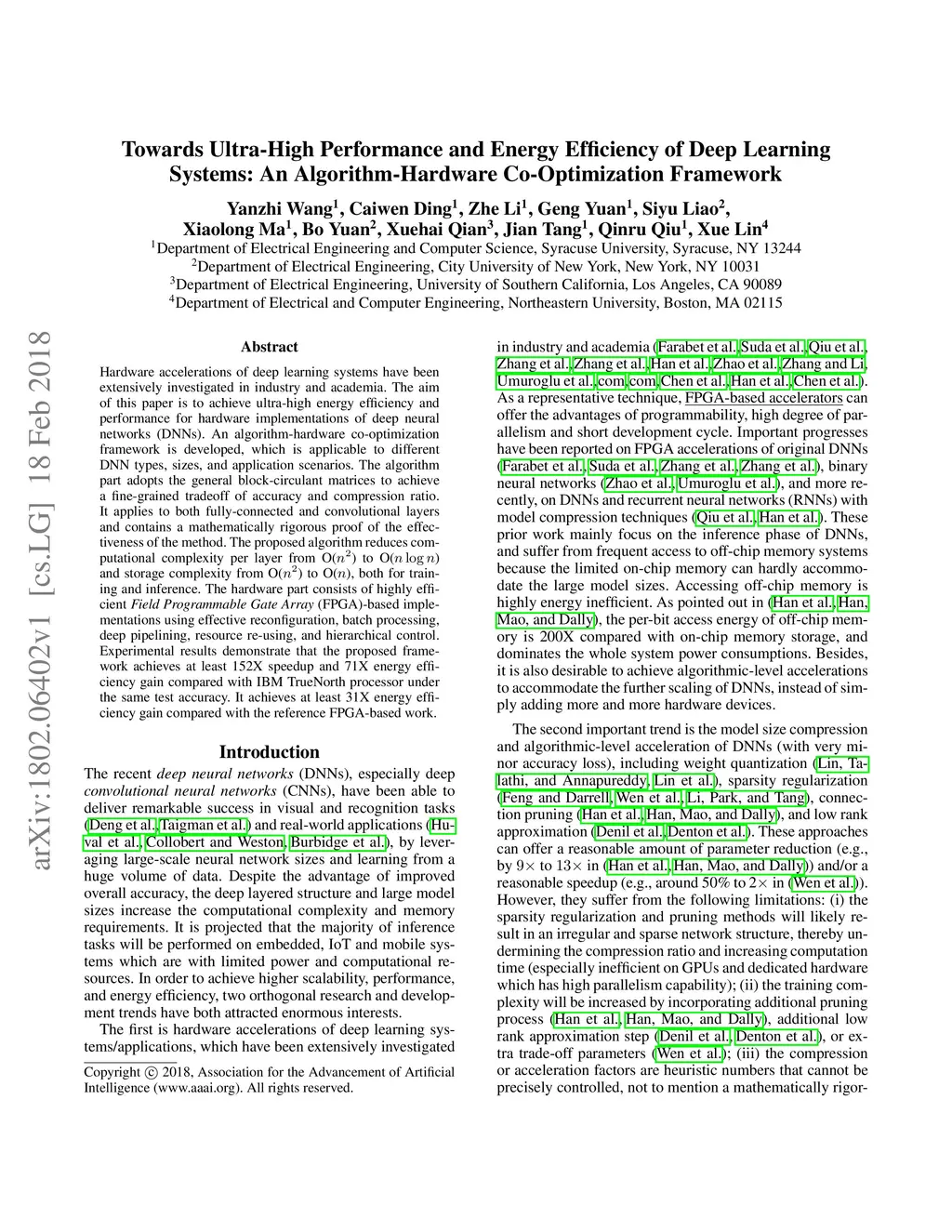 Hardware accelerations of deep learning systems have been extensively investigated in industry and academia. The aim of this paper is to achieve ultra-high energy efficiency and performance for hardware implementations of deep neural networks (DNNs). An algorithm-hardware co-optimization framework is developed, which is applicable to different DNN types, sizes, and application scenarios. The algorithm part adopts the general block-circulant matrices to achieve a fine-grained tradeoff between accuracy and compression ratio. It applies to both fully-connected and convolutional layers and contains a mathematically rigorous proof of the effectiveness of the method. The proposed algorithm reduces computational complexity per layer from O() to O() and storage complexity from O() to O(), both for training and inference. The hardware part consists of highly efficient Field Programmable Gate Array (FPGA)-based implementations using effective reconfiguration, batch processing, deep pipelining, resource re-using, and hierarchical control. Experimental results demonstrate that the proposed framework achieves at least 152X speedup and 71X energy efficiency gain compared with IBM TrueNorth processor under the same test accuracy. It achieves at least 31X energy efficiency gain compared with the reference FPGA-based work.