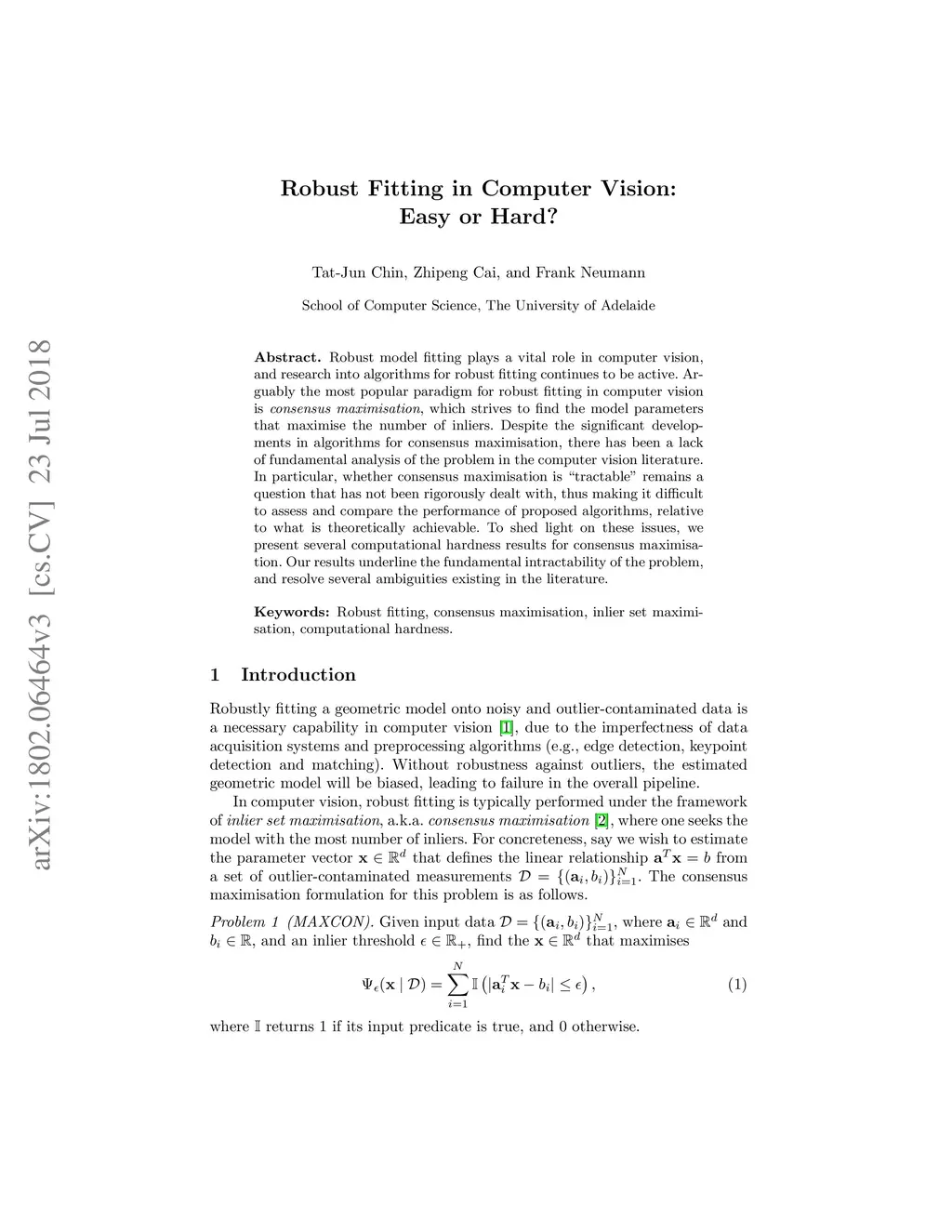 Robust model fitting plays a vital role in computer vision, and research into algorithms for robust fitting continues to be active. Arguably the most popular paradigm for robust fitting in computer vision is consensus maximisation, which strives to find the model parameters that maximise the number of inliers. Despite the significant developments in algorithms for consensus maximisation, there has been a lack of fundamental analysis of the problem in the computer vision literature. In particular, whether consensus maximisation is "tractable" remains a question that has not been rigorously dealt with, thus making it difficult to assess and compare the performance of proposed algorithms, relative to what is theoretically achievable. To shed light on these issues, we present several computational hardness results for consensus maximisation. Our results underline the fundamental intractability of the problem, and resolve several ambiguities existing in the literature.