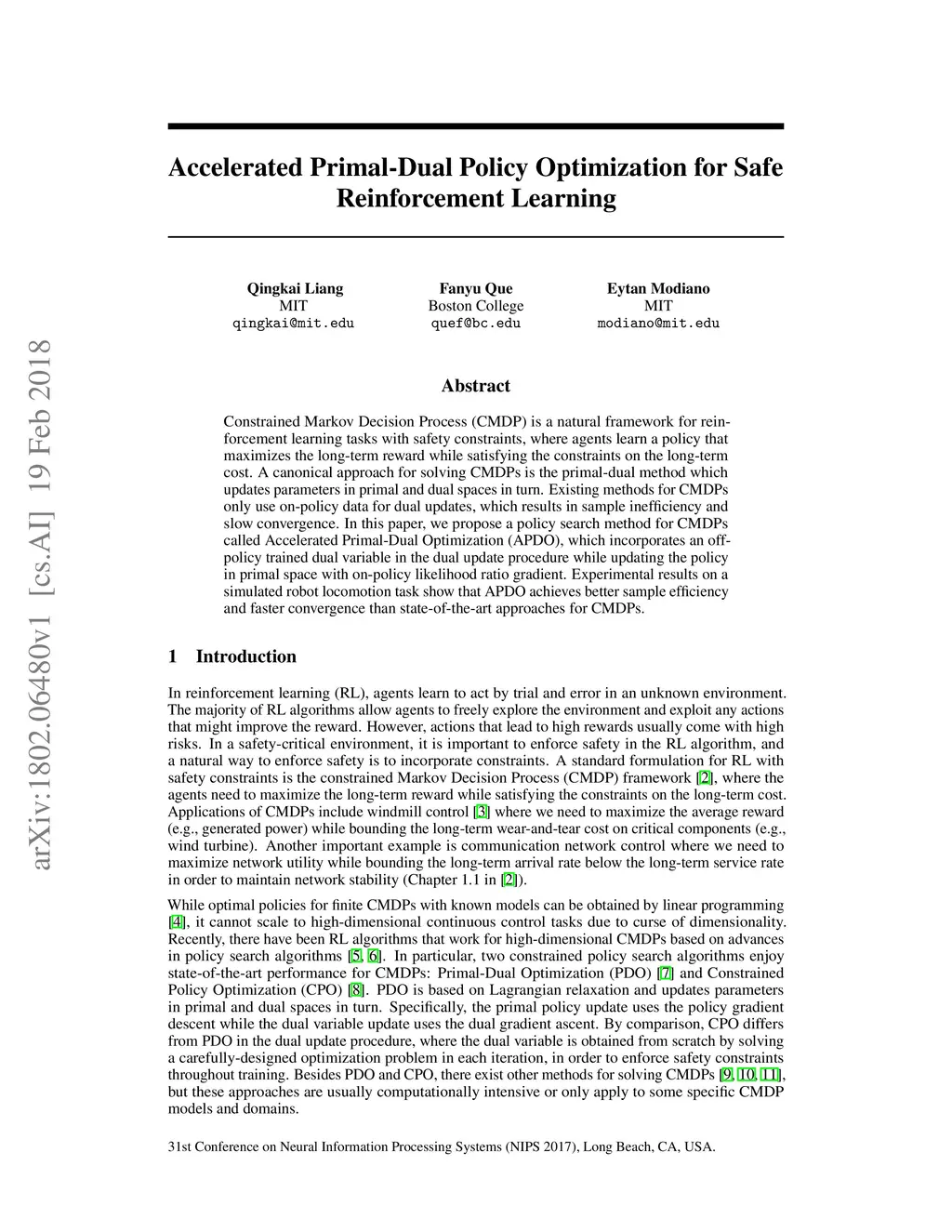 Constrained Markov Decision Process (CMDP) is a natural framework for reinforcement learning tasks with safety constraints, where agents learn a policy that maximizes the long-term reward while satisfying the constraints on the long-term cost. A canonical approach for solving CMDPs is the primal-dual method which updates parameters in primal and dual spaces in turn. Existing methods for CMDPs only use on-policy data for dual updates, which results in sample inefficiency and slow convergence. In this paper, we propose a policy search method for CMDPs called Accelerated Primal-Dual Optimization (APDO), which incorporates an off-policy trained dual variable in the dual update procedure while updating the policy in primal space with on-policy likelihood ratio gradient. Experimental results on a simulated robot locomotion task show that APDO achieves better sample efficiency and faster convergence than state-of-the-art approaches for CMDPs.