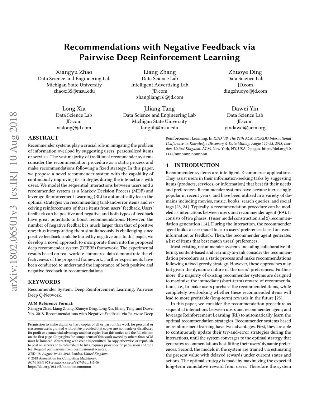 Recommendations with Negative Feedback via Pairwise Deep Reinforcement