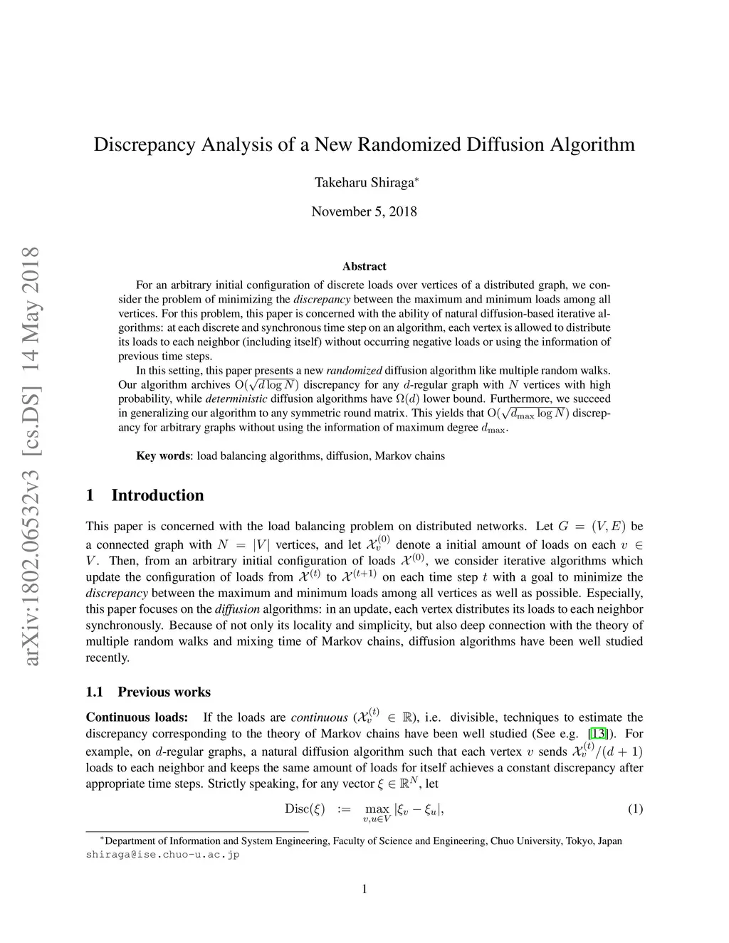 For an arbitrary initial configuration of discrete loads over vertices of a distributed graph, we consider the problem of minimizing the {\em discrepancy} between the maximum and minimum loads among all vertices. For this problem, this paper is concerned with the ability of natural diffusion-based iterative algorithms: at each discrete and synchronous time step on an algorithm, each vertex is allowed to distribute its loads to each neighbor (including itself) without occurring negative loads or using the information of previous time steps. In this setting, this paper presents a new {\em randomized} diffusion algorithm like multiple random walks. Our algorithm archives discrepancy for any -regular graph with vertices with high probability, while {\em deterministic} diffusion algorithms have lower bound. Furthermore, we succeed in generalizing our algorithm to any symmetric round matrix. This yields that discrepancy for arbitrary graphs without using the information of maximum degree .