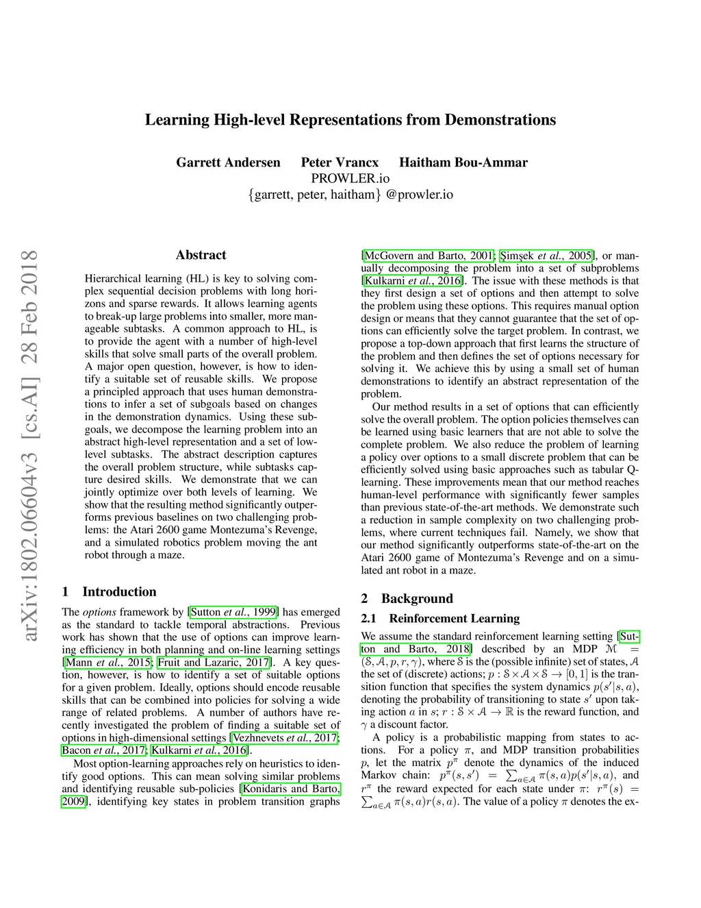 Hierarchical learning (HL) is key to solving complex sequential decision problems with long horizons and sparse rewards. It allows learning agents to break-up large problems into smaller, more manageable subtasks. A common approach to HL, is to provide the agent with a number of high-level skills that solve small parts of the overall problem. A major open question, however, is how to identify a suitable set of reusable skills. We propose a principled approach that uses human demonstrations to infer a set of subgoals based on changes in the demonstration dynamics. Using these subgoals, we decompose the learning problem into an abstract high-level representation and a set of low-level subtasks. The abstract description captures the overall problem structure, while subtasks capture desired skills. We demonstrate that we can jointly optimize over both levels of learning. We show that the resulting method significantly outperforms previous baselines on two challenging problems: the Atari 2600 game Montezuma's Revenge, and a simulated robotics problem moving the ant robot through a maze.