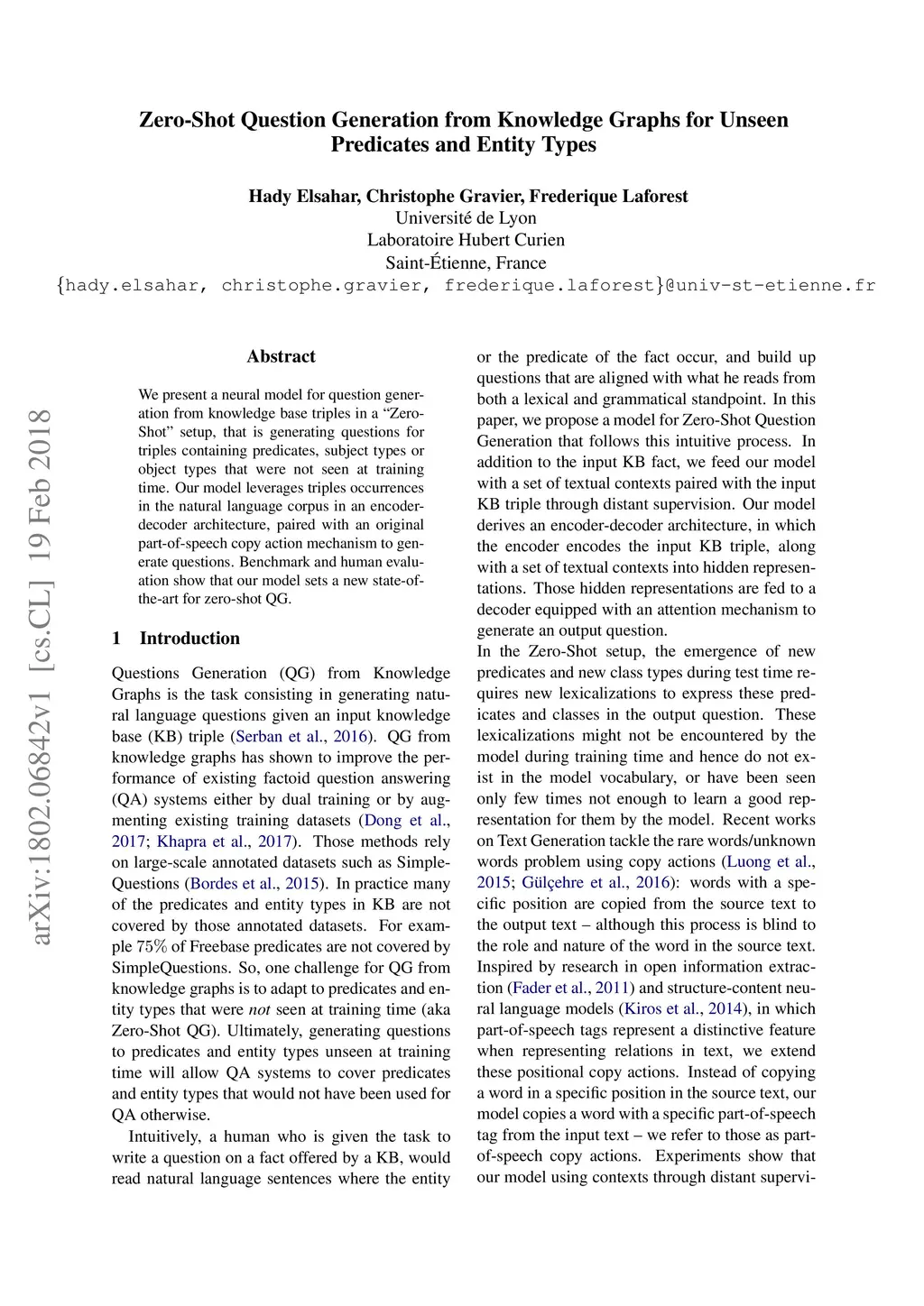 We present a neural model for question generation from knowledge base triples in a "Zero-Shot" setup, that is generating questions for triples containing predicates, subject types or object types that were not seen at training time. Our model leverages triples occurrences in the natural language corpus in an encoder-decoder architecture, paired with an original part-of-speech copy action mechanism to generate questions. Benchmark and human evaluation show that our model sets a new state-of-the-art for zero-shot QG.