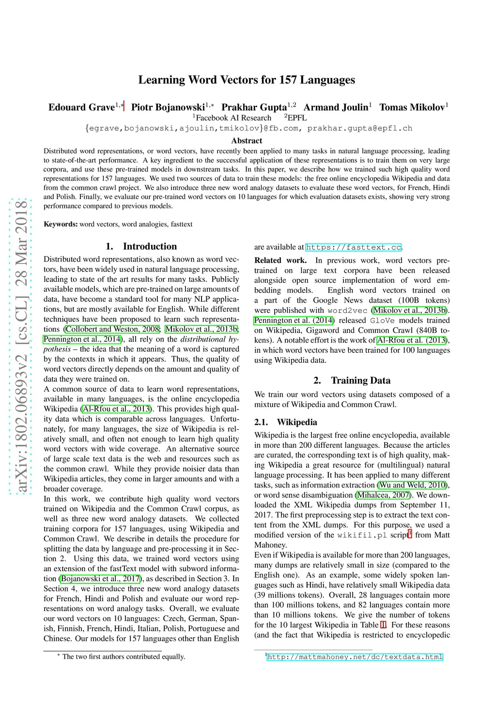 Learning Word Vectors for 157 Languages