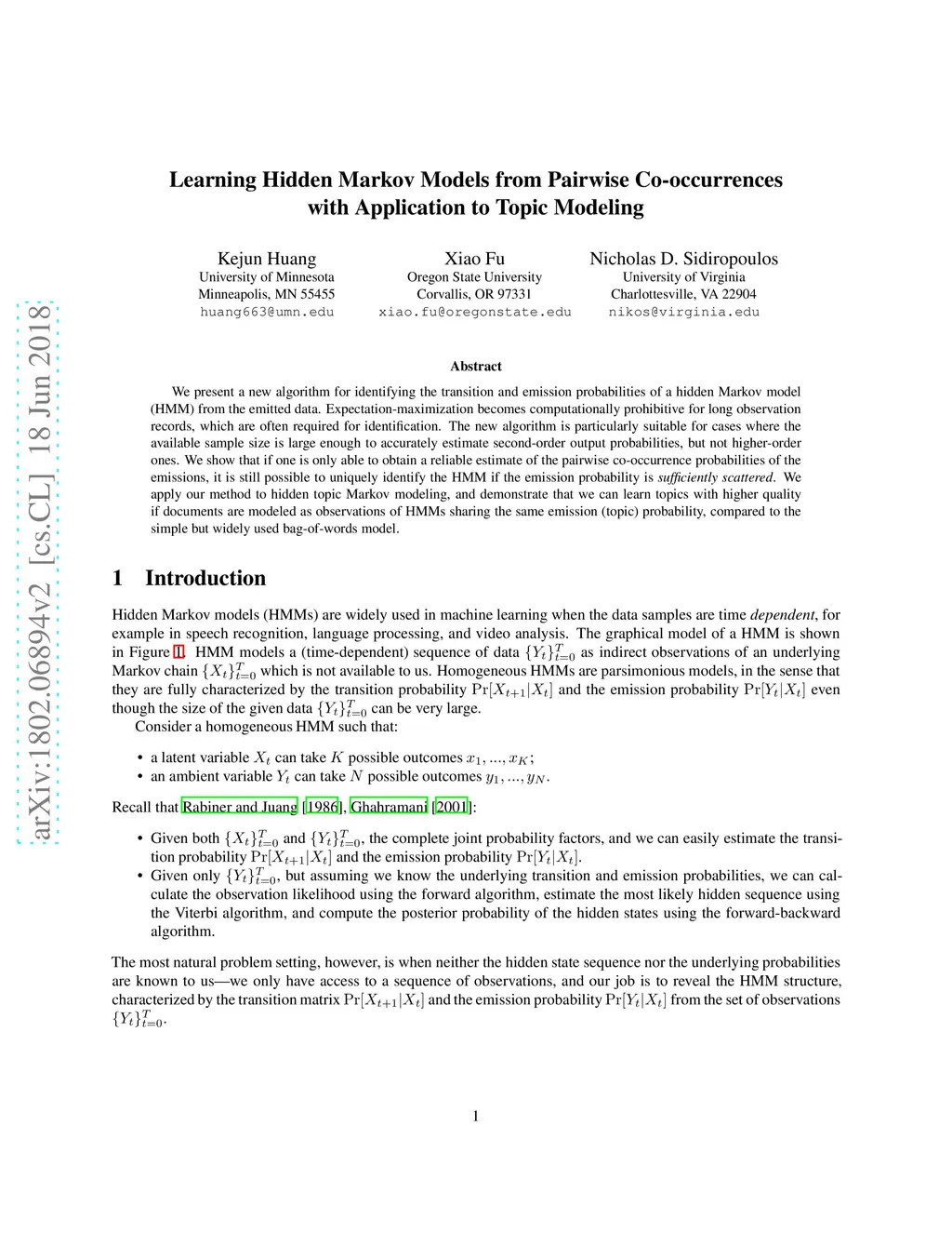 We present a new algorithm for identifying the transition and emission probabilities of a hidden Markov model (HMM) from the emitted data. Expectation-maximization becomes computationally prohibitive for long observation records, which are often required for identification. The new algorithm is particularly suitable for cases where the available sample size is large enough to accurately estimate second-order output probabilities, but not higher-order ones. We show that if one is only able to obtain a reliable estimate of the pairwise co-occurrence probabilities of the emissions, it is still possible to uniquely identify the HMM if the emission probability is \emph{sufficiently scattered}. We apply our method to hidden topic Markov modeling, and demonstrate that we can learn topics with higher quality if documents are modeled as observations of HMMs sharing the same emission (topic) probability, compared to the simple but widely used bag-of-words model.