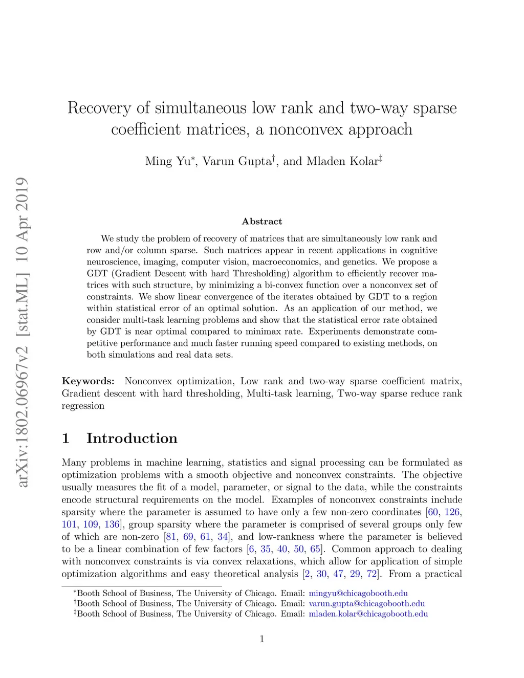 We study the problem of recovery of matrices that are simultaneously low rank and row and/or column sparse. Such matrices appear in recent applications in cognitive neuroscience, imaging, computer vision, macroeconomics, and genetics. We propose a GDT (Gradient Descent with hard Thresholding) algorithm to efficiently recover matrices with such structure, by minimizing a bi-convex function over a nonconvex set of constraints. We show linear convergence of the iterates obtained by GDT to a region within statistical error of an optimal solution. As an application of our method, we consider multi-task learning problems and show that the statistical error rate obtained by GDT is near optimal compared to minimax rate. Experiments demonstrate competitive performance and much faster running speed compared to existing methods, on both simulations and real data sets.