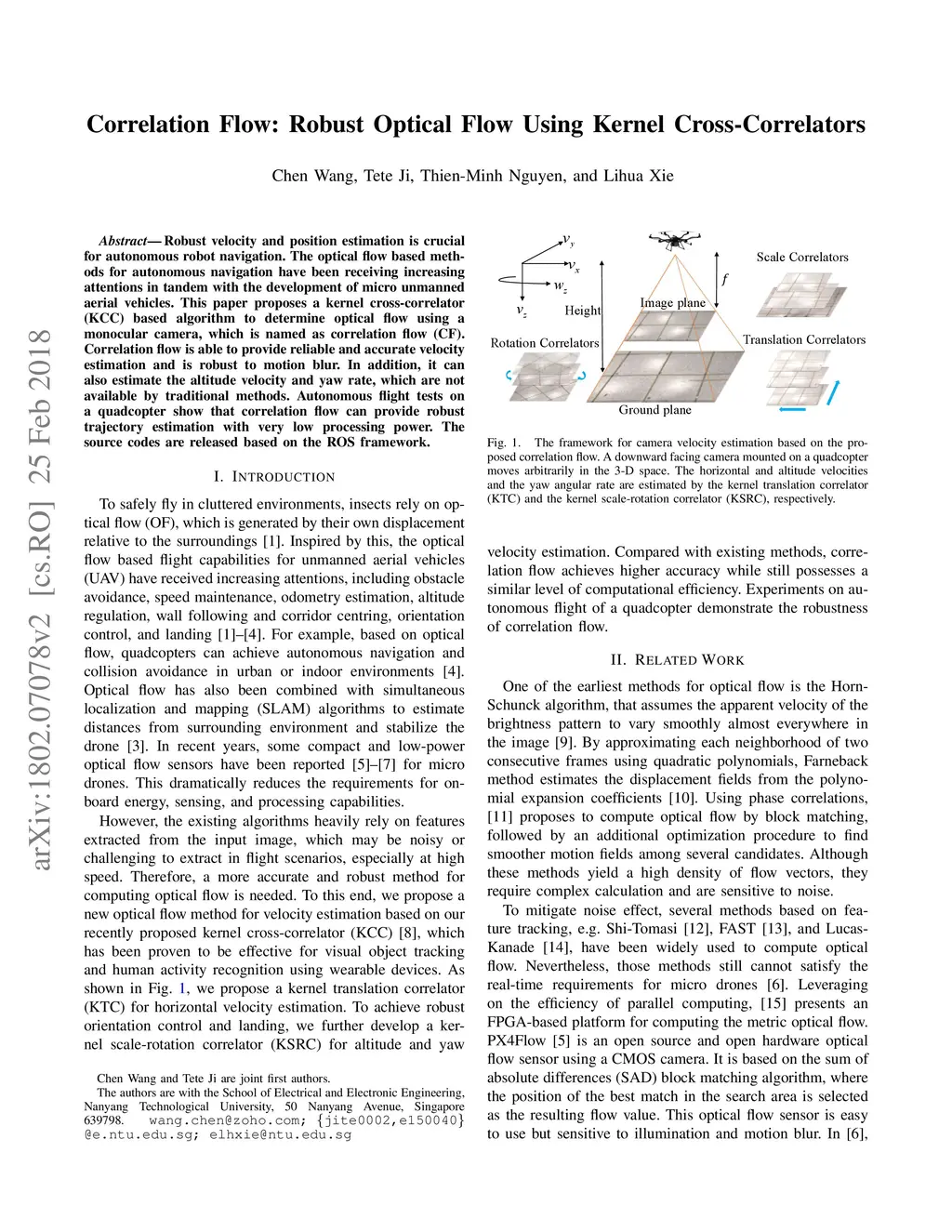 Robust velocity and position estimation is crucial for autonomous robot navigation. The optical flow based methods for autonomous navigation have been receiving increasing attentions in tandem with the development of micro unmanned aerial vehicles. This paper proposes a kernel cross-correlator (KCC) based algorithm to determine optical flow using a monocular camera, which is named as correlation flow (CF). Correlation flow is able to provide reliable and accurate velocity estimation and is robust to motion blur. In addition, it can also estimate the altitude velocity and yaw rate, which are not available by traditional methods. Autonomous flight tests on a quadcopter show that correlation flow can provide robust trajectory estimation with very low processing power. The source codes are released based on the ROS framework.