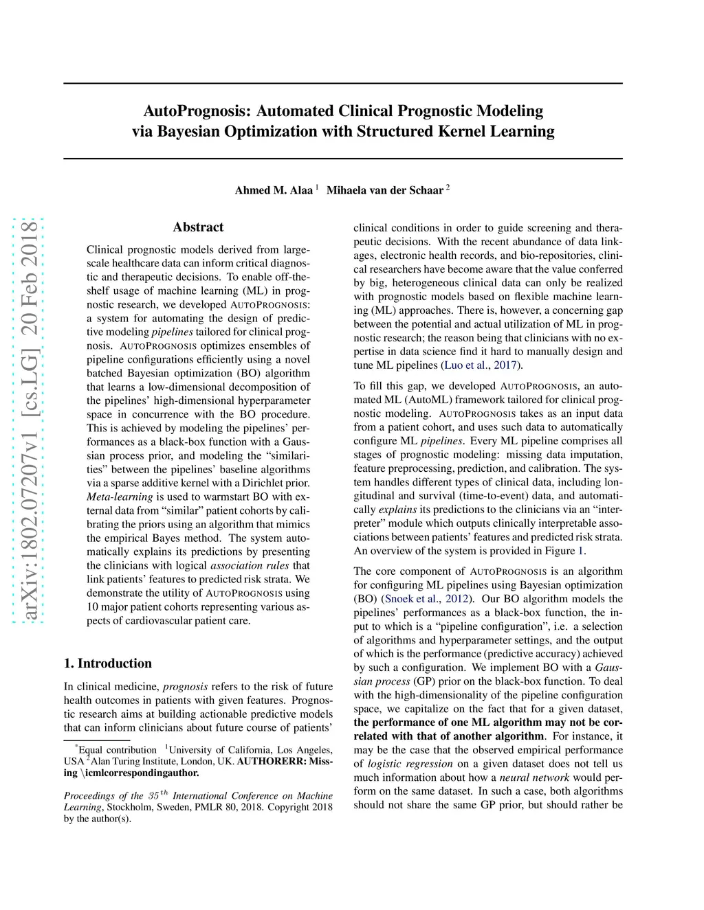Clinical prognostic models derived from largescale healthcare data can inform critical diagnostic and therapeutic decisions. To enable off-theshelf usage of machine learning (ML) in prognostic research, we developed AUTOPROGNOSIS: a system for automating the design of predictive modeling pipelines tailored for clinical prognosis. AUTOPROGNOSIS optimizes ensembles of pipeline configurations efficiently using a novel batched Bayesian optimization (BO) algorithm that learns a low-dimensional decomposition of the pipelines high-dimensional hyperparameter space in concurrence with the BO procedure. This is achieved by modeling the pipelines performances as a black-box function with a Gaussian process prior, and modeling the similarities between the pipelines baseline algorithms via a sparse additive kernel with a Dirichlet prior. Meta-learning is used to warmstart BO with external data from similar patient cohorts by calibrating the priors using an algorithm that mimics the empirical Bayes method. The system automatically explains its predictions by presenting the clinicians with logical association rules that link patients features to predicted risk strata. We demonstrate the utility of AUTOPROGNOSIS using 10 major patient cohorts representing various aspects of cardiovascular patient care.