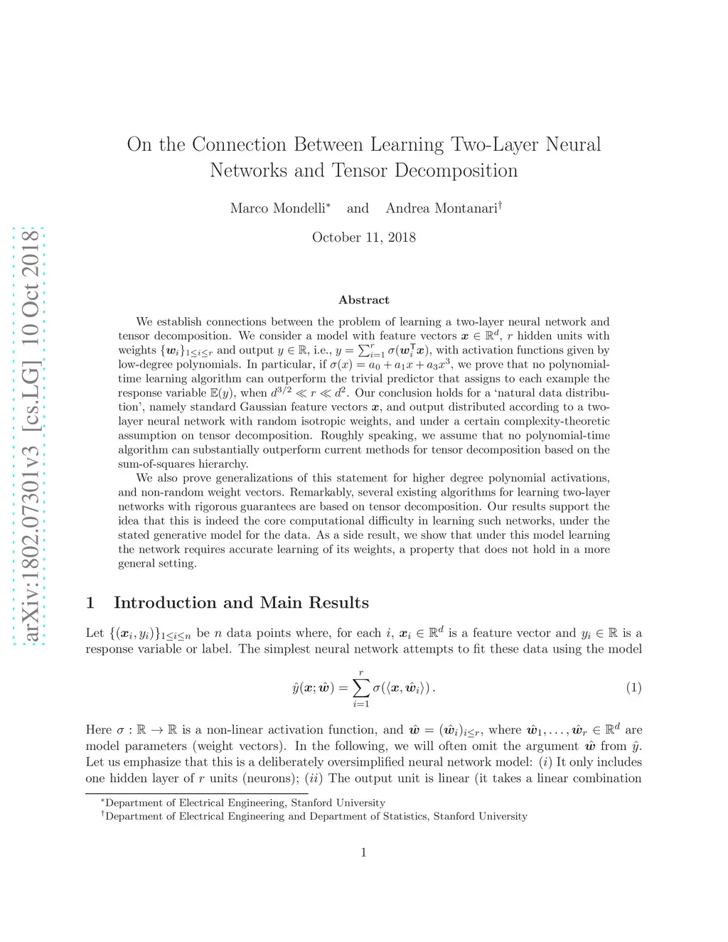 We establish connections between the problem of learning a two-layer neural network and tensor decomposition. We consider a model with feature vectors , hidden units with weights and output , i.e., , with activation functions given by low-degree polynomials. In particular, if , we prove that no polynomial-time learning algorithm can outperform the trivial predictor that assigns to each example the response variable , when . Our conclusion holds for a `natural data distribution', namely standard Gaussian feature vectors , and output distributed according to a two-layer neural network with random isotropic weights, and under a certain complexity-theoretic assumption on tensor decomposition. Roughly speaking, we assume that no polynomial-time algorithm can substantially outperform current methods for tensor decomposition based on the sum-of-squares hierarchy. We also prove generalizations of this statement for higher degree polynomial activations, and non-random weight vectors. Remarkably, several existing algorithms for learning two-layer networks with rigorous guarantees are based on tensor decomposition. Our results support the idea that this is indeed the core computational difficulty in learning such networks, under the stated generative model for the data. As a side result, we show that under this model learning the network requires accurate learning of its weights, a property that does not hold in a more general setting.