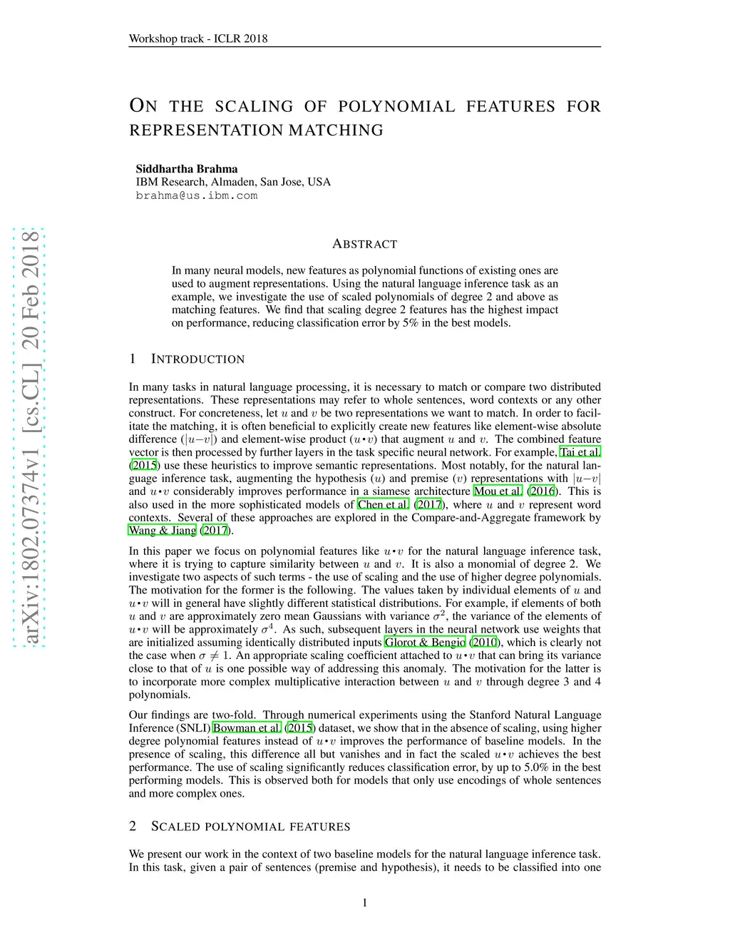 In many neural models, new features as polynomial functions of existing ones are used to augment representations. Using the natural language inference task as an example, we investigate the use of scaled polynomials of degree 2 and above as matching features. We find that scaling degree 2 features has the highest impact on performance, reducing classification error by 5% in the best models.