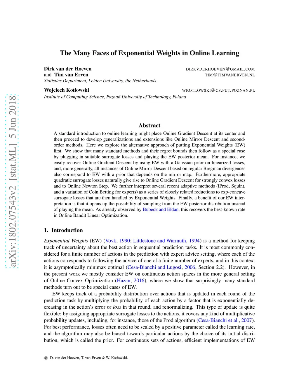 A standard introduction to online learning might place Online Gradient Descent at its center and then proceed to develop generalizations and extensions like Online Mirror Descent and second-order methods. Here we explore the alternative approach of putting Exponential Weights (EW) first. We show that many standard methods and their regret bounds then follow as a special case by plugging in suitable surrogate losses and playing the EW posterior mean. For instance, we easily recover Online Gradient Descent by using EW with a Gaussian prior on linearized losses, and, more generally, all instances of Online Mirror Descent based on regular Bregman divergences also correspond to EW with a prior that depends on the mirror map. Furthermore, appropriate quadratic surrogate losses naturally give rise to Online Gradient Descent for strongly convex losses and to Online Newton Step. We further interpret several recent adaptive methods (iProd, Squint, and a variation of Coin Betting for experts) as a series of closely related reductions to exp-concave surrogate losses that are then handled by Exponential Weights. Finally, a benefit of our EW interpretation is that it opens up the possibility of sampling from the EW posterior distribution instead of playing the mean. As already observed by Bubeck and Eldan, this recovers the best-known rate in Online Bandit Linear Optimization.