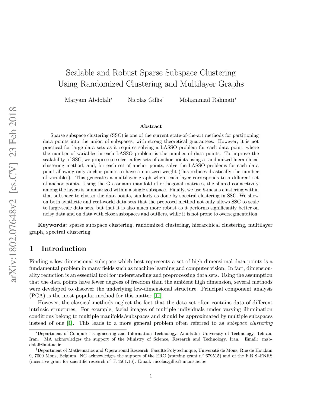 Sparse subspace clustering (SSC) is one of the current state-of-the-art methods for partitioning data points into the union of subspaces, with strong theoretical guarantees. However, it is not practical for large data sets as it requires solving a LASSO problem for each data point, where the number of variables in each LASSO problem is the number of data points. To improve the scalability of SSC, we propose to select a few sets of anchor points using a randomized hierarchical clustering method, and, for each set of anchor points, solve the LASSO problems for each data point allowing only anchor points to have a non-zero weight (this reduces drastically the number of variables). This generates a multilayer graph where each layer corresponds to a different set of anchor points. Using the Grassmann manifold of orthogonal matrices, the shared connectivity among the layers is summarized within a single subspace. Finally, we use -means clustering within that subspace to cluster the data points, similarly as done by spectral clustering in SSC. We show on both synthetic and real-world data sets that the proposed method not only allows SSC to scale to large-scale data sets, but that it is also much more robust as it performs significantly better on noisy data and on data with close susbspaces and outliers, while it is not prone to oversegmentation.