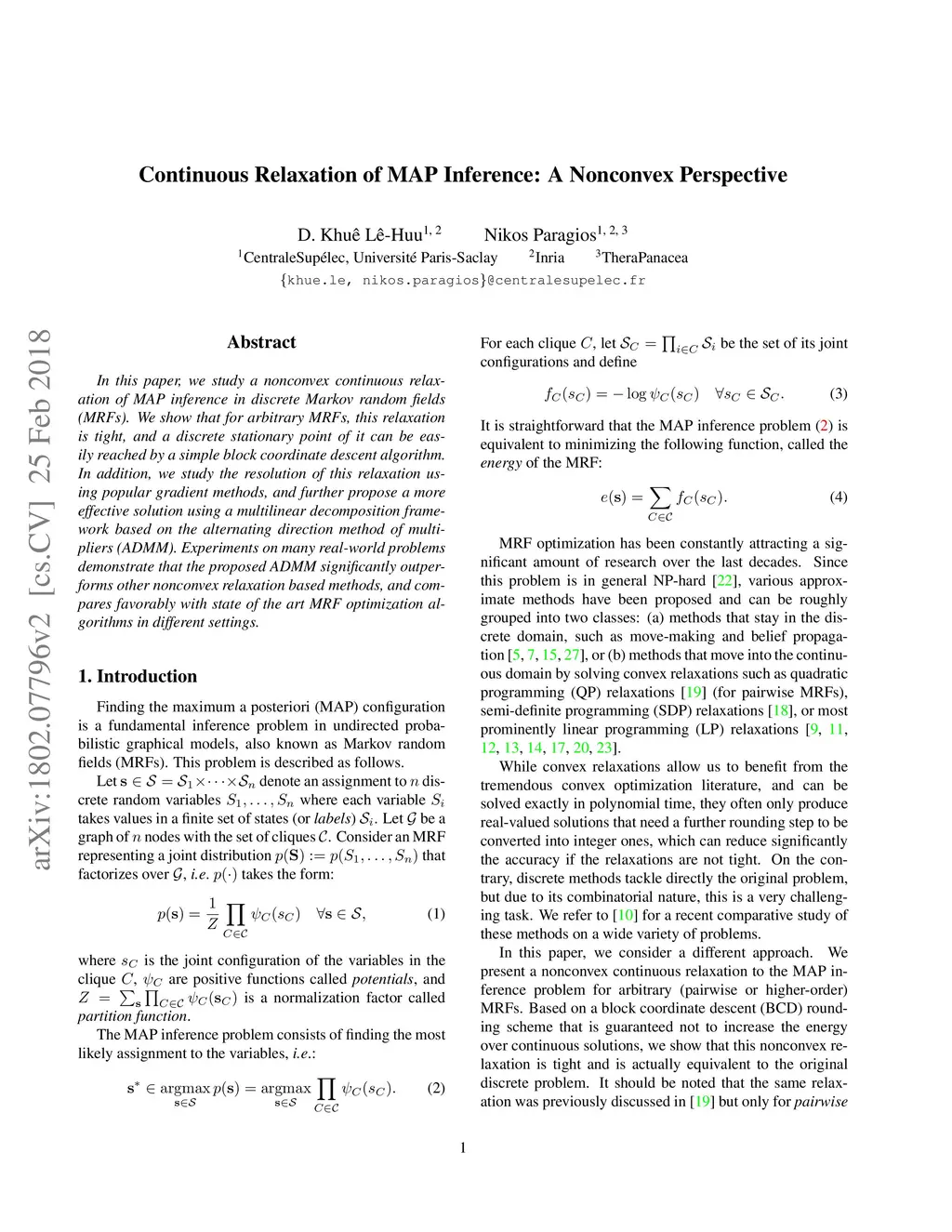 In this paper, we study a nonconvex continuous relaxation of MAP inference in discrete Markov random fields (MRFs). We show that for arbitrary MRFs, this relaxation is tight, and a discrete stationary point of it can be easily reached by a simple block coordinate descent algorithm. In addition, we study the resolution of this relaxation using popular gradient methods, and further propose a more effective solution using a multilinear decomposition framework based on the alternating direction method of multipliers (ADMM). Experiments on many real-world problems demonstrate that the proposed ADMM significantly outperforms other nonconvex relaxation based methods, and compares favorably with state of the art MRF optimization algorithms in different settings.