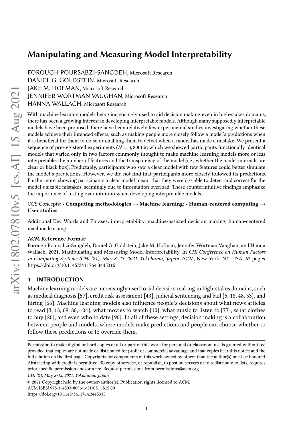 With machine learning models being increasingly used to aid decision making even in high-stakes domains, there has been a growing interest in developing interpretable models. Although many supposedly interpretable models have been proposed, there have been relatively few experimental studies investigating whether these models achieve their intended effects, such as making people more closely follow a model's predictions when it is beneficial for them to do so or enabling them to detect when a model has made a mistake. We present a sequence of pre-registered experiments (N=3,800) in which we showed participants functionally identical models that varied only in two factors commonly thought to make machine learning models more or less interpretable: the number of features and the transparency of the model (i.e., whether the model internals are clear or black box). Predictably, participants who saw a clear model with few features could better simulate the model's predictions. However, we did not find that participants more closely followed its predictions. Furthermore, showing participants a clear model meant that they were less able to detect and correct for the model's sizable mistakes, seemingly due to information overload. These counterintuitive findings emphasize the importance of testing over intuition when developing interpretable models.