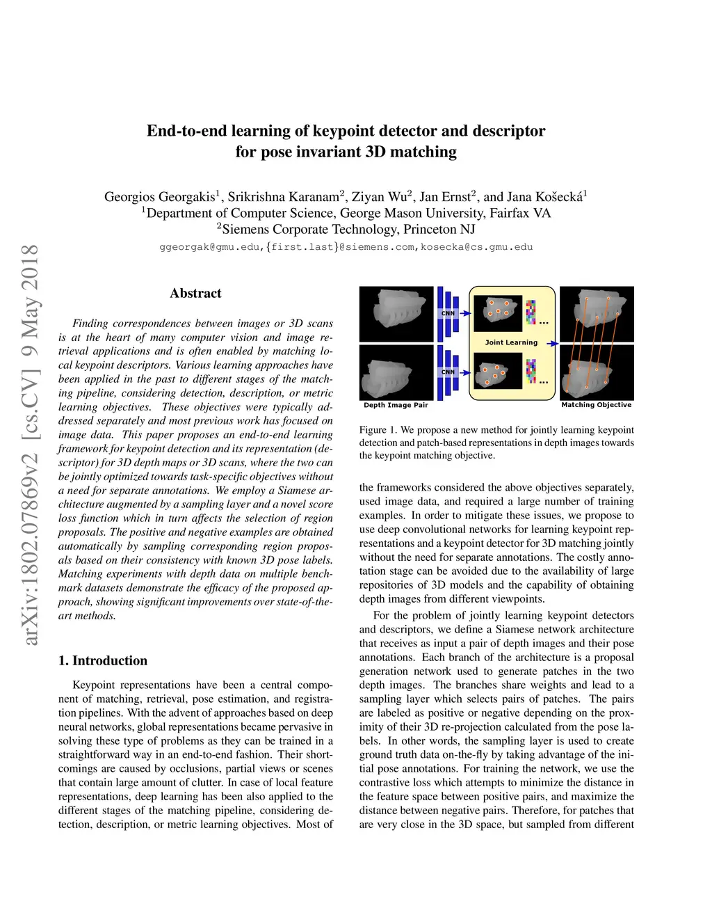 Finding correspondences between images or 3D scans is at the heart of many computer vision and image retrieval applications and is often enabled by matching local keypoint descriptors. Various learning approaches have been applied in the past to different stages of the matching pipeline, considering detector, descriptor, or metric learning objectives. These objectives were typically addressed separately and most previous work has focused on image data. This paper proposes an end-to-end learning framework for keypoint detection and its representation (descriptor) for 3D depth maps or 3D scans, where the two can be jointly optimized towards task-specific objectives without a need for separate annotations. We employ a Siamese architecture augmented by a sampling layer and a novel score loss function which in turn affects the selection of region proposals. The positive and negative examples are obtained automatically by sampling corresponding region proposals based on their consistency with known 3D pose labels. Matching experiments with depth data on multiple benchmark datasets demonstrate the efficacy of the proposed approach, showing significant improvements over state-of-the-art methods.