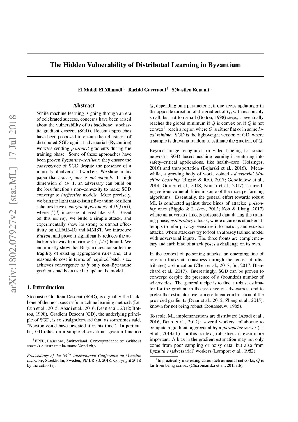 While machine learning is going through an era of celebrated success, concerns have been raised about the vulnerability of its backbone: stochastic gradient descent (SGD). Recent approaches have been proposed to ensure the robustness of distributed SGD against adversarial (Byzantine) workers sending poisoned gradients during the training phase. Some of these approaches have been proven Byzantine-resilient: they ensure the convergence of SGD despite the presence of a minority of adversarial workers. We show in this paper that convergence is not enough. In high dimension , an adver\-sary can build on the loss function's non-convexity to make SGD converge to ineffective models. More precisely, we bring to light that existing Byzantine-resilient schemes leave a margin of poisoning of , where increases at least like . Based on this leeway, we build a simple attack, and experimentally show its strong to utmost effectivity on CIFAR-10 and MNIST. We introduce Bulyan, and prove it significantly reduces the attackers leeway to a narrow bound. We empirically show that Bulyan does not suffer the fragility of existing aggregation rules and, at a reasonable cost in terms of required batch size, achieves convergence as if only non-Byzantine gradients had been used to update the model.