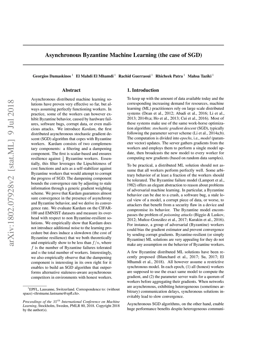 Asynchronous distributed machine learning solutions have proven very effective so far, but always assuming perfectly functioning workers. In practice, some of the workers can however exhibit Byzantine behavior, caused by hardware failures, software bugs, corrupt data, or even malicious attacks. We introduce \emph{Kardam}, the first distributed asynchronous stochastic gradient descent (SGD) algorithm that copes with Byzantine workers. Kardam consists of two complementary components: a filtering and a dampening component. The first is scalar-based and ensures resilience against Byzantine workers. Essentially, this filter leverages the Lipschitzness of cost functions and acts as a self-stabilizer against Byzantine workers that would attempt to corrupt the progress of SGD. The dampening component bounds the convergence rate by adjusting to stale information through a generic gradient weighting scheme. We prove that Kardam guarantees almost sure convergence in the presence of asynchrony and Byzantine behavior, and we derive its convergence rate. We evaluate Kardam on the CIFAR-100 and EMNIST datasets and measure its overhead with respect to non Byzantine-resilient solutions. We empirically show that Kardam does not introduce additional noise to the learning procedure but does induce a slowdown (the cost of Byzantine resilience) that we both theoretically and empirically show to be less than , where is the number of Byzantine failures tolerated and the total number of workers. Interestingly, we also empirically observe that the dampening component is interesting in its own right for it enables to build an SGD algorithm that outperforms alternative staleness-aware asynchronous competitors in environments with honest workers.