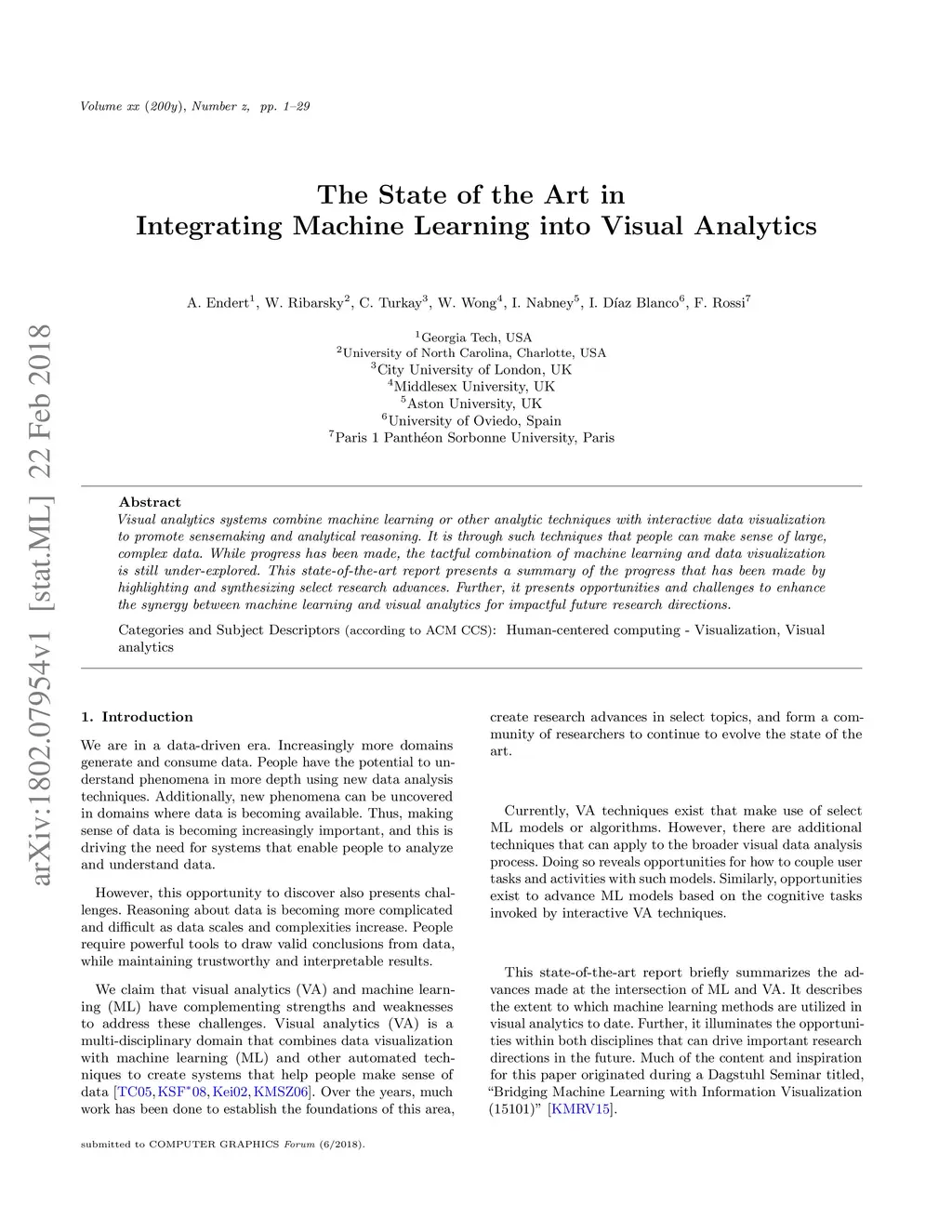Visual analytics systems combine machine learning or other analytic techniques with interactive data visualization to promote sensemaking and analytical reasoning. It is through such techniques that people can make sense of large, complex data. While progress has been made, the tactful combination of machine learning and data visualization is still under-explored. This state-of-the-art report presents a summary of the progress that has been made by highlighting and synthesizing select research advances. Further, it presents opportunities and challenges to enhance the synergy between machine learning and visual analytics for impactful future research directions.