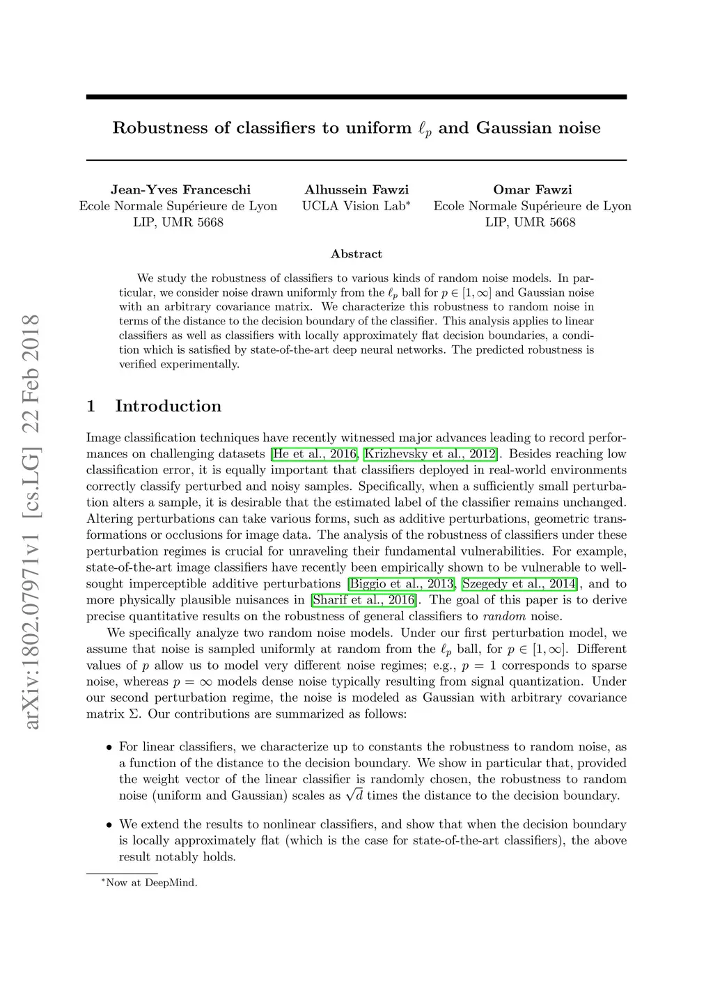 We study the robustness of classifiers to various kinds of random noise models. In particular, we consider noise drawn uniformly from the ball for and Gaussian noise with an arbitrary covariance matrix. We characterize this robustness to random noise in terms of the distance to the decision boundary of the classifier. This analysis applies to linear classifiers as well as classifiers with locally approximately flat decision boundaries, a condition which is satisfied by state-of-the-art deep neural networks. The predicted robustness is verified experimentally.