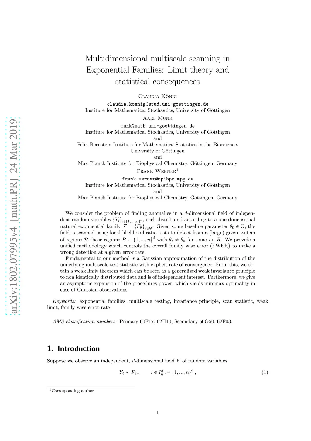 We consider the problem of finding anomalies in a -dimensional field of independent random variables , each distributed according to a one-dimensional natural exponential family . Given some baseline parameter , the field is scanned using local likelihood ratio tests to detect from a (large) given system of regions those regions with for some . We provide a unified methodology which controls the overall family wise error (FWER) to make a wrong detection at a given error rate. Fundamental to our method is a Gaussian approximation of the distribution of the underlying multiscale test statistic with explicit rate of convergence. From this, we obtain a weak limit theorem which can be seen as a generalized weak invariance principle to non identically distributed data and is of independent interest. Furthermore, we give an asymptotic expansion of the procedures power, which yields minimax optimality in case of Gaussian observations.