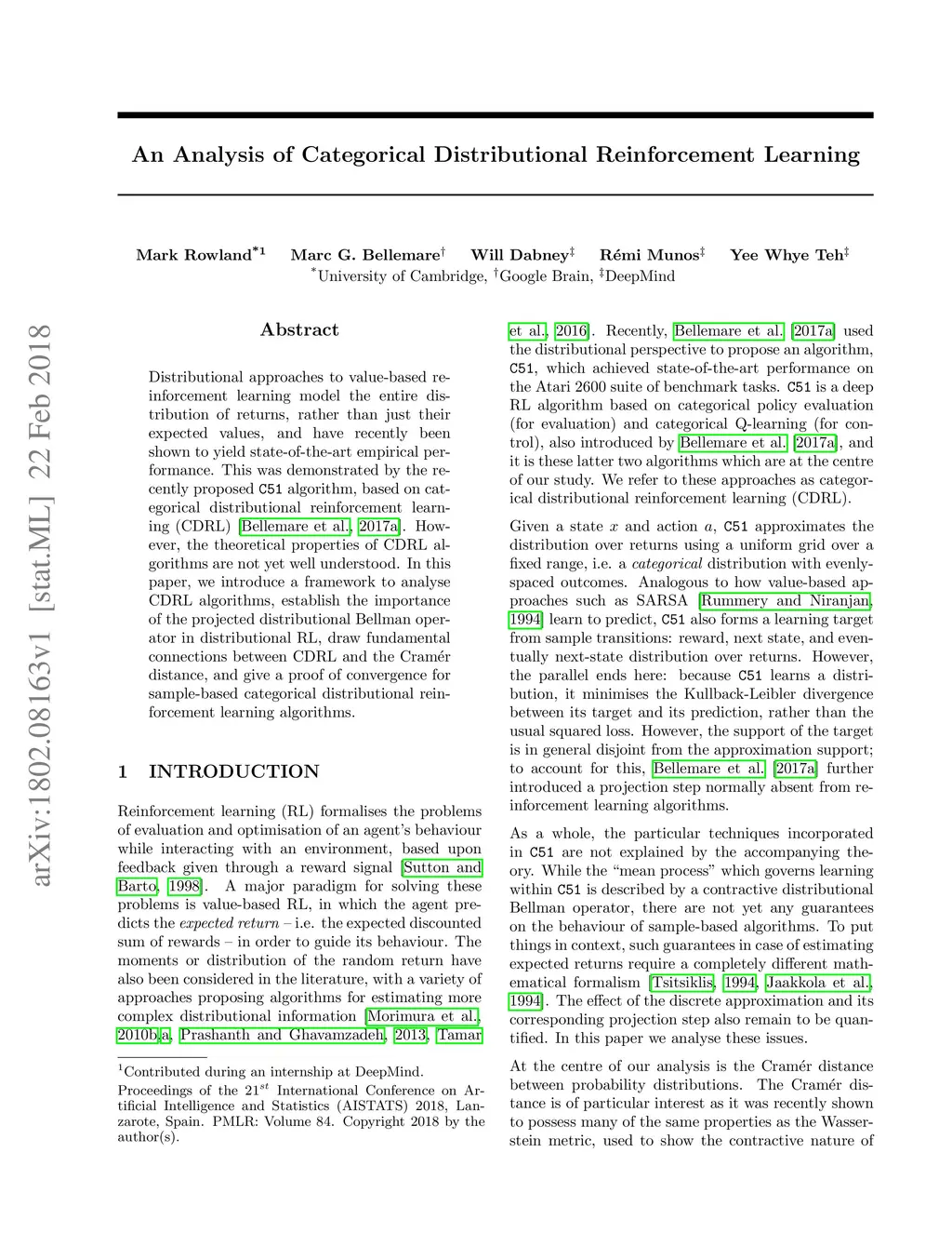 Distributional approaches to value-based reinforcement learning model the entire distribution of returns, rather than just their expected values, and have recently been shown to yield state-of-the-art empirical performance. This was demonstrated by the recently proposed C51 algorithm, based on categorical distributional reinforcement learning (CDRL) [Bellemare et al., 2017]. However, the theoretical properties of CDRL algorithms are not yet well understood. In this paper, we introduce a framework to analyse CDRL algorithms, establish the importance of the projected distributional Bellman operator in distributional RL, draw fundamental connections between CDRL and the Cram\ér distance, and give a proof of convergence for sample-based categorical distributional reinforcement learning algorithms.