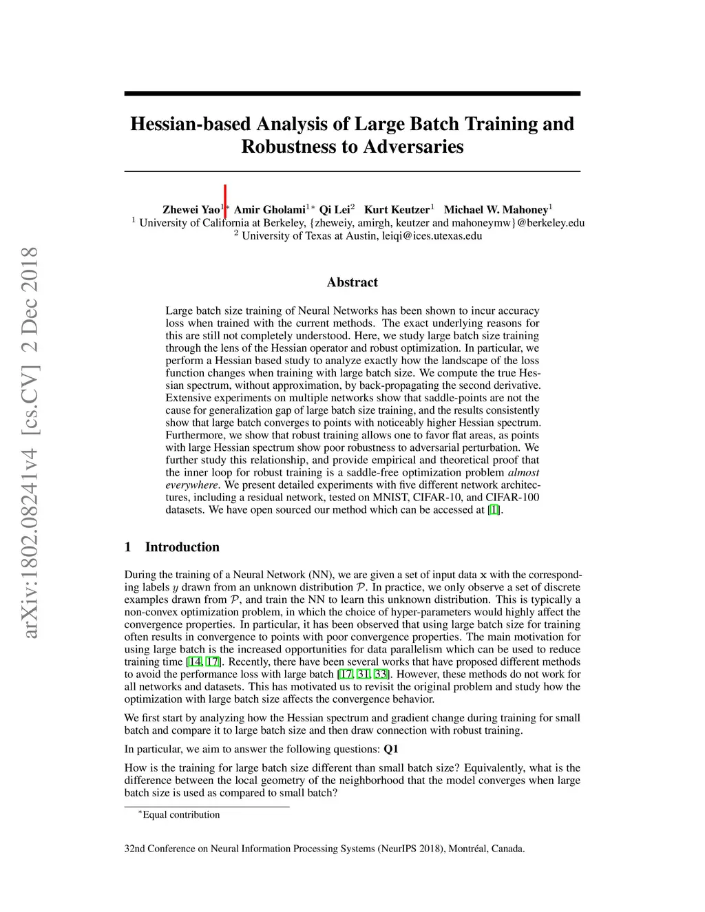 Large batch size training of Neural Networks has been shown to incur accuracy loss when trained with the current methods. The exact underlying reasons for this are still not completely understood. Here, we study large batch size training through the lens of the Hessian operator and robust optimization. In particular, we perform a Hessian based study to analyze exactly how the landscape of the loss function changes when training with large batch size. We compute the true Hessian spectrum, without approximation, by back-propagating the second derivative. Extensive experiments on multiple networks show that saddle-points are not the cause for generalization gap of large batch size training, and the results consistently show that large batch converges to points with noticeably higher Hessian spectrum. Furthermore, we show that robust training allows one to favor flat areas, as points with large Hessian spectrum show poor robustness to adversarial perturbation. We further study this relationship, and provide empirical and theoretical proof that the inner loop for robust training is a saddle-free optimization problem \textit{almost everywhere}. We present detailed experiments with five different network architectures, including a residual network, tested on MNIST, CIFAR-10, and CIFAR-100 datasets. We have open sourced our method which can be accessed at [1].
