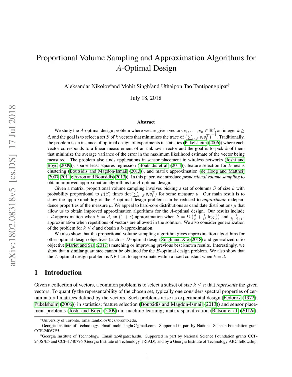 Proportional Volume Sampling and Approximation Algorithms for A-Optimal