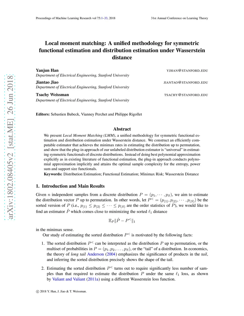 We present \emph{Local Moment Matching (LMM)}, a unified methodology for symmetric functional estimation and distribution estimation under Wasserstein distance. We construct an efficiently computable estimator that achieves the minimax rates in estimating the distribution up to permutation, and show that the plug-in approach of our unlabeled distribution estimator is "universal" in estimating symmetric functionals of discrete distributions. Instead of doing best polynomial approximation explicitly as in existing literature of functional estimation, the plug-in approach conducts polynomial approximation implicitly and attains the optimal sample complexity for the entropy, power sum and support size functionals.