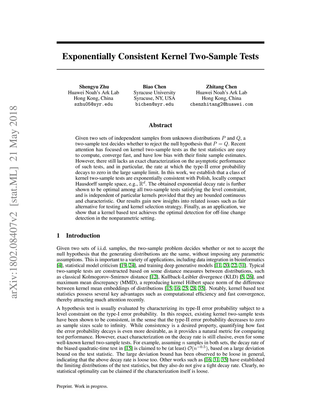 Given two sets of independent samples from unknown distributions and , a two-sample test decides whether to reject the null hypothesis that . Recent attention has focused on kernel two-sample tests as the test statistics are easy to compute, converge fast, and have low bias with their finite sample estimates. However, there still lacks an exact characterization on the asymptotic performance of such tests, and in particular, the rate at which the type-II error probability decays to zero in the large sample limit. In this work, we establish that a class of kernel two-sample tests are exponentially consistent with Polish, locally compact Hausdorff sample space, e.g., . The obtained exponential decay rate is further shown to be optimal among all two-sample tests satisfying the level constraint, and is independent of particular kernels provided that they are bounded continuous and characteristic. Our results gain new insights into related issues such as fair alternative for testing and kernel selection strategy. Finally, as an application, we show that a kernel based test achieves the optimal detection for off-line change detection in the nonparametric setting.