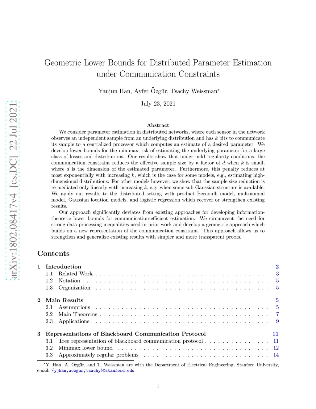 We consider parameter estimation in distributed networks, where each sensor in the network observes an independent sample from an underlying distribution and has bits to communicate its sample to a centralized processor which computes an estimate of a desired parameter. We develop lower bounds for the minimax risk of estimating the underlying parameter for a large class of losses and distributions. Our results show that under mild regularity conditions, the communication constraint reduces the effective sample size by a factor of when is small, where is the dimension of the estimated parameter. Furthermore, this penalty reduces at most exponentially with increasing , which is the case for some models, e.g., estimating high-dimensional distributions. For other models however, we show that the sample size reduction is re-mediated only linearly with increasing , e.g. when some sub-Gaussian structure is available. We apply our results to the distributed setting with product Bernoulli model, multinomial model, Gaussian location models, and logistic regression which recover or strengthen existing results. Our approach significantly deviates from existing approaches for developing information-theoretic lower bounds for communication-efficient estimation. We circumvent the need for strong data processing inequalities used in prior work and develop a geometric approach which builds on a new representation of the communication constraint. This approach allows us to strengthen and generalize existing results with simpler and more transparent proofs.
