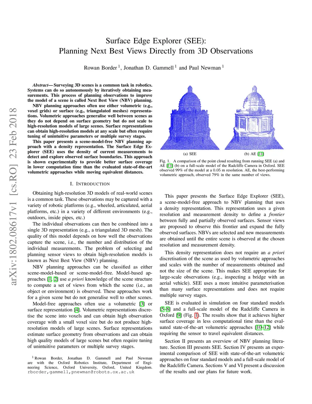 Surveying 3D scenes is a common task in robotics. Systems can do so autonomously by iteratively obtaining measurements. This process of planning observations to improve the model of a scene is called Next Best View (NBV) planning. NBV planning approaches often use either volumetric (e.g., voxel grids) or surface (e.g., triangulated meshes) representations. Volumetric approaches generalise well between scenes as they do not depend on surface geometry but do not scale to high-resolution models of large scenes. Surface representations can obtain high-resolution models at any scale but often require tuning of unintuitive parameters or multiple survey stages. This paper presents a scene-model-free NBV planning approach with a density representation. The Surface Edge Explorer (SEE) uses the density of current measurements to detect and explore observed surface boundaries. This approach is shown experimentally to provide better surface coverage in lower computation time than the evaluated state-of-the-art volumetric approaches while moving equivalent distances.
