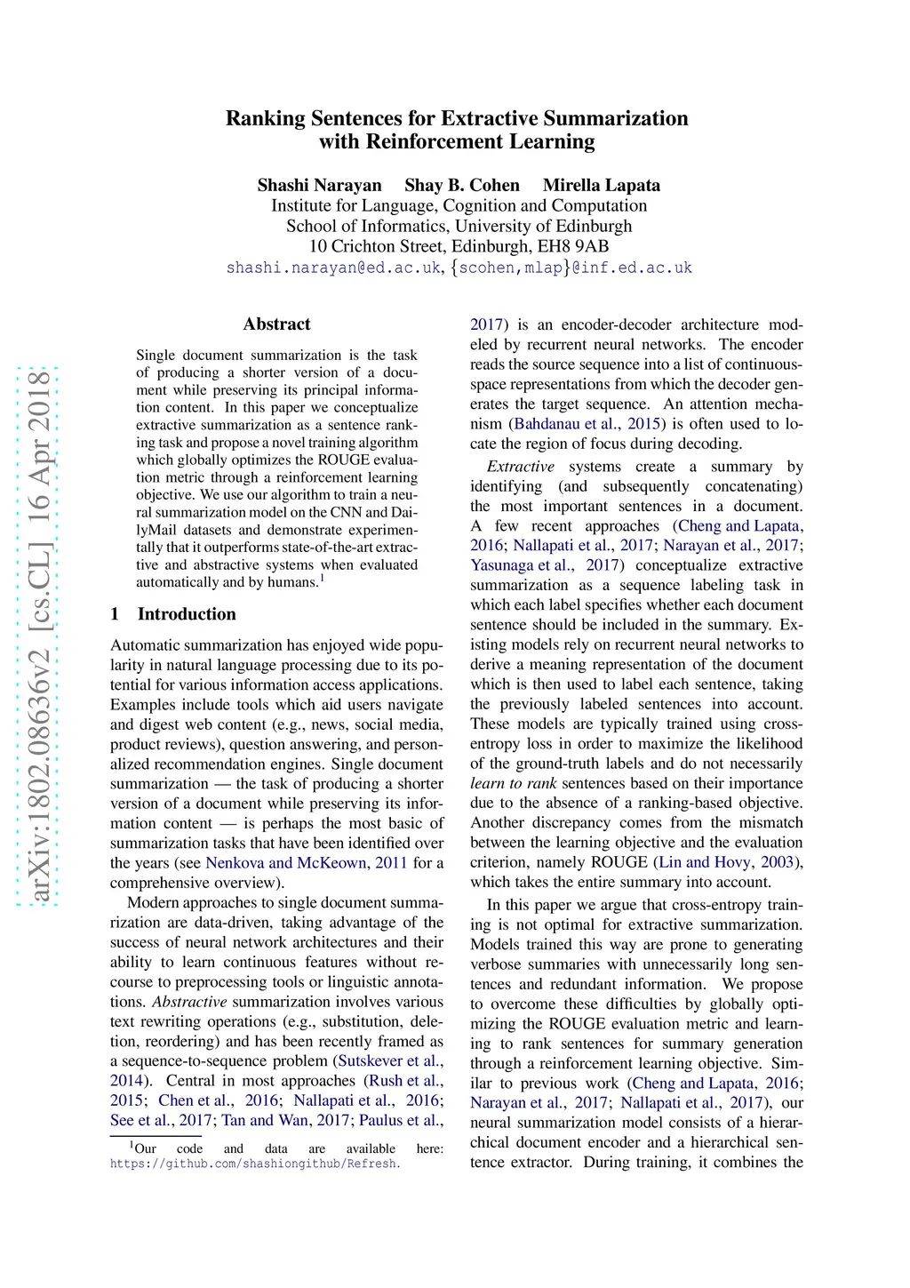 Single document summarization is the task of producing a shorter version of a document while preserving its principal information content. In this paper we conceptualize extractive summarization as a sentence ranking task and propose a novel training algorithm which globally optimizes the ROUGE evaluation metric through a reinforcement learning objective. We use our algorithm to train a neural summarization model on the CNN and DailyMail datasets and demonstrate experimentally that it outperforms state-of-the-art extractive and abstractive systems when evaluated automatically and by humans.