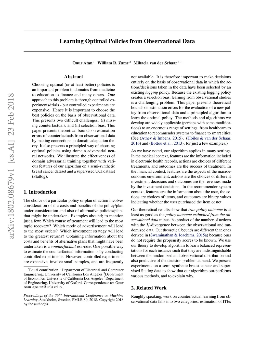 Choosing optimal (or at least better) policies is an important problem in domains from medicine to education to finance and many others. One approach to this problem is through controlled experiments/trials - but controlled experiments are expensive. Hence it is important to choose the best policies on the basis of observational data. This presents two difficult challenges: (i) missing counterfactuals, and (ii) selection bias. This paper presents theoretical bounds on estimation errors of counterfactuals from observational data by making connections to domain adaptation theory. It also presents a principled way of choosing optimal policies using domain adversarial neural networks. We illustrate the effectiveness of domain adversarial training together with various features of our algorithm on a semi-synthetic breast cancer dataset and a supervised UCI dataset (Statlog).