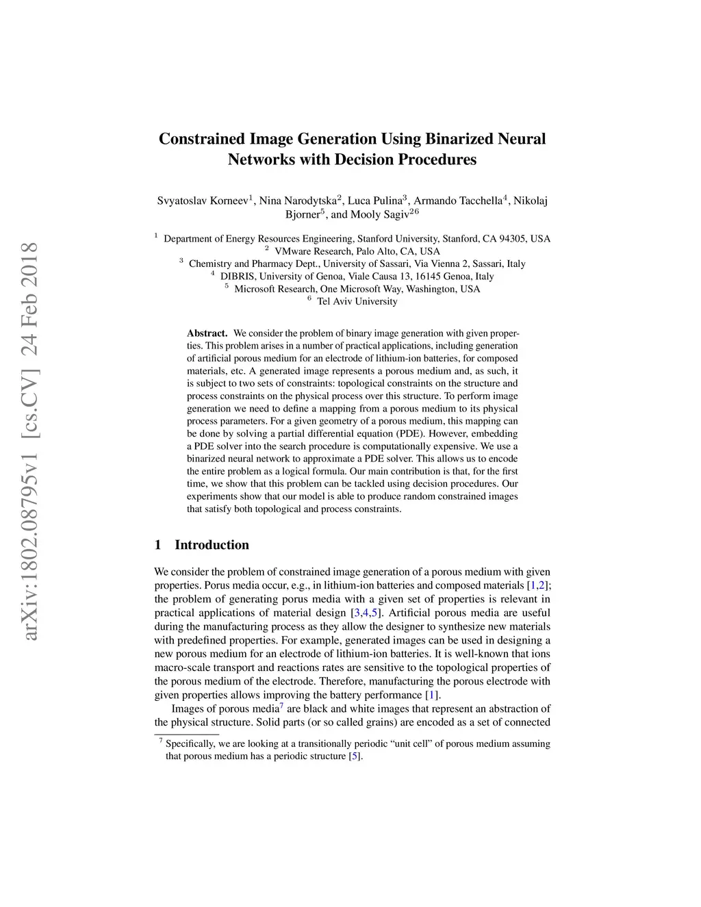 We consider the problem of binary image generation with given properties. This problem arises in a number of practical applications, including generation of artificial porous medium for an electrode of lithium-ion batteries, for composed materials, etc. A generated image represents a porous medium and, as such, it is subject to two sets of constraints: topological constraints on the structure and process constraints on the physical process over this structure. To perform image generation we need to define a mapping from a porous medium to its physical process parameters. For a given geometry of a porous medium, this mapping can be done by solving a partial differential equation (PDE). However, embedding a PDE solver into the search procedure is computationally expensive. We use a binarized neural network to approximate a PDE solver. This allows us to encode the entire problem as a logical formula. Our main contribution is that, for the first time, we show that this problem can be tackled using decision procedures. Our experiments show that our model is able to produce random constrained images that satisfy both topological and process constraints.