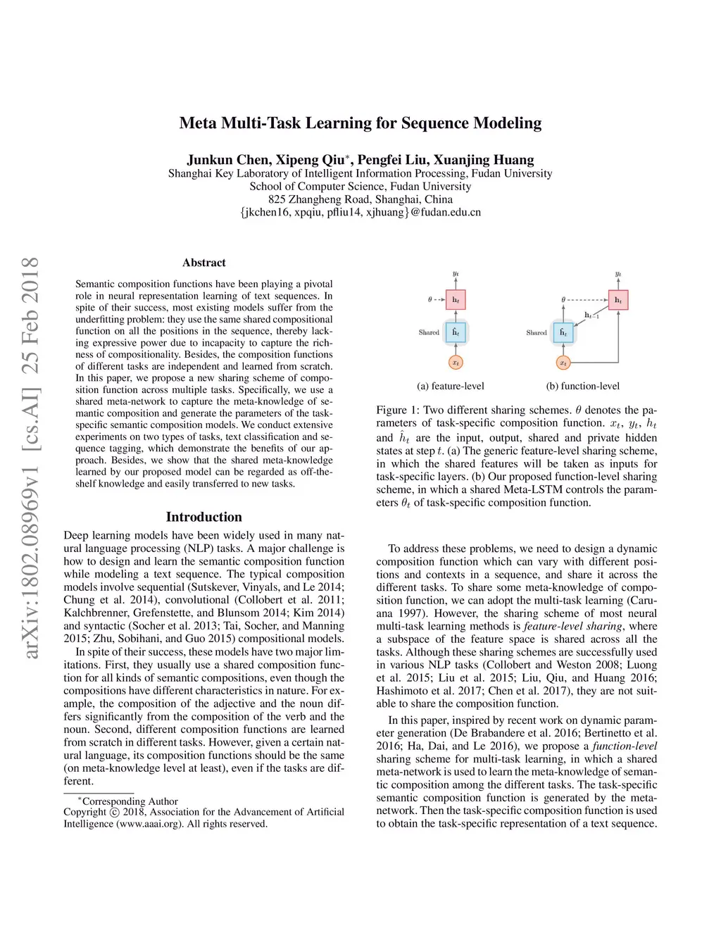 Semantic composition functions have been playing a pivotal role in neural representation learning of text sequences. In spite of their success, most existing models suffer from the underfitting problem: they use the same shared compositional function on all the positions in the sequence, thereby lacking expressive power due to incapacity to capture the richness of compositionality. Besides, the composition functions of different tasks are independent and learned from scratch. In this paper, we propose a new sharing scheme of composition function across multiple tasks. Specifically, we use a shared meta-network to capture the meta-knowledge of semantic composition and generate the parameters of the task-specific semantic composition models. We conduct extensive experiments on two types of tasks, text classification and sequence tagging, which demonstrate the benefits of our approach. Besides, we show that the shared meta-knowledge learned by our proposed model can be regarded as off-the-shelf knowledge and easily transferred to new tasks.