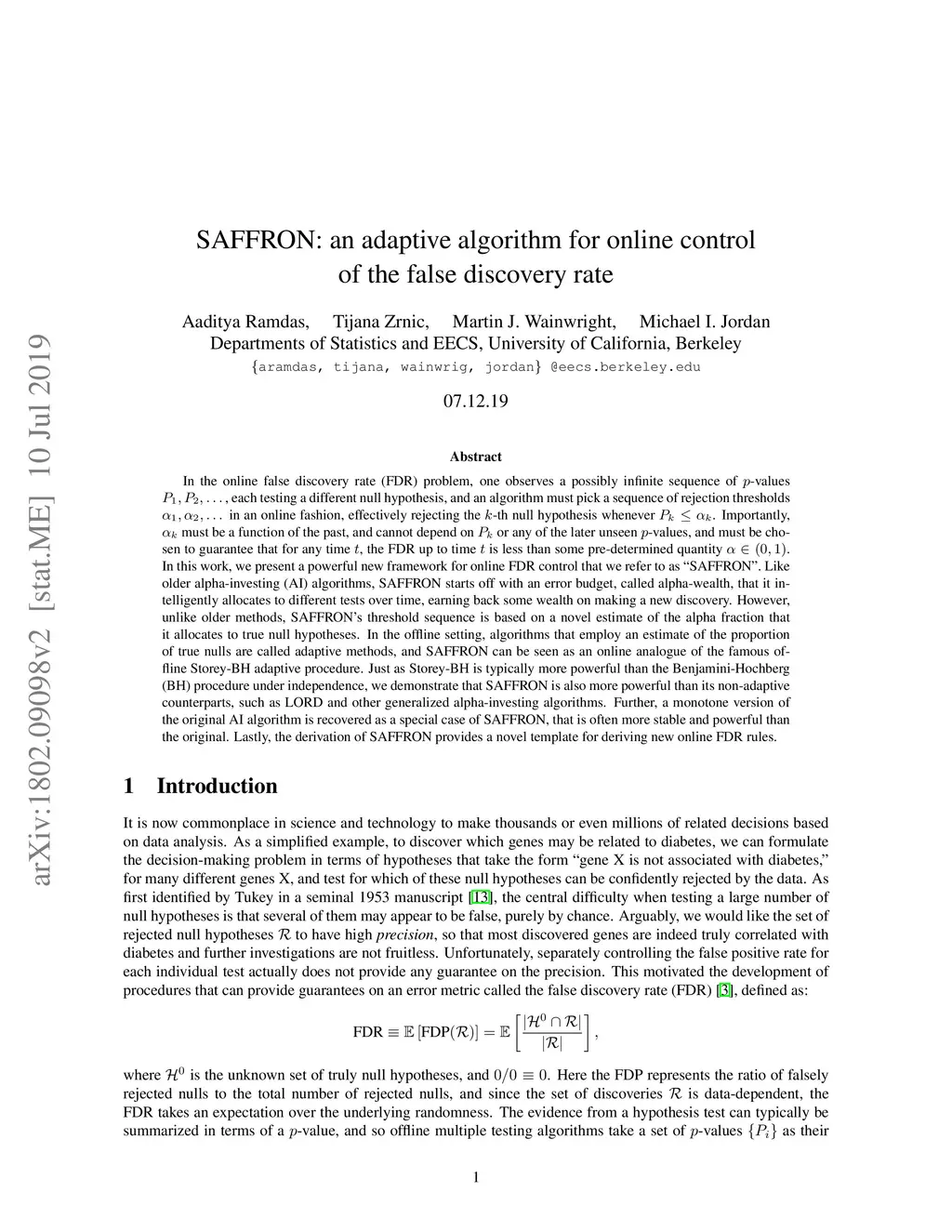 SAFFRON: an adaptive algorithm for online control of the false discovery
