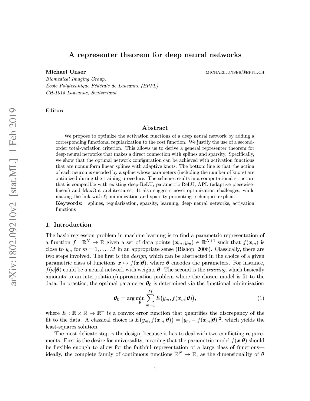 We propose to optimize the activation functions of a deep neural network by adding a corresponding functional regularization to the cost function. We justify the use of a second-order total-variation criterion. This allows us to derive a general representer theorem for deep neural networks that makes a direct connection with splines and sparsity. Specifically, we show that the optimal network configuration can be achieved with activation functions that are nonuniform linear splines with adaptive knots. The bottom line is that the action of each neuron is encoded by a spline whose parameters (including the number of knots) are optimized during the training procedure. The scheme results in a computational structure that is compatible with the existing deep-ReLU, parametric ReLU, APL (adaptive piecewise-linear) and MaxOut architectures. It also suggests novel optimization challenges, while making the link with minimization and sparsity-promoting techniques explicit.