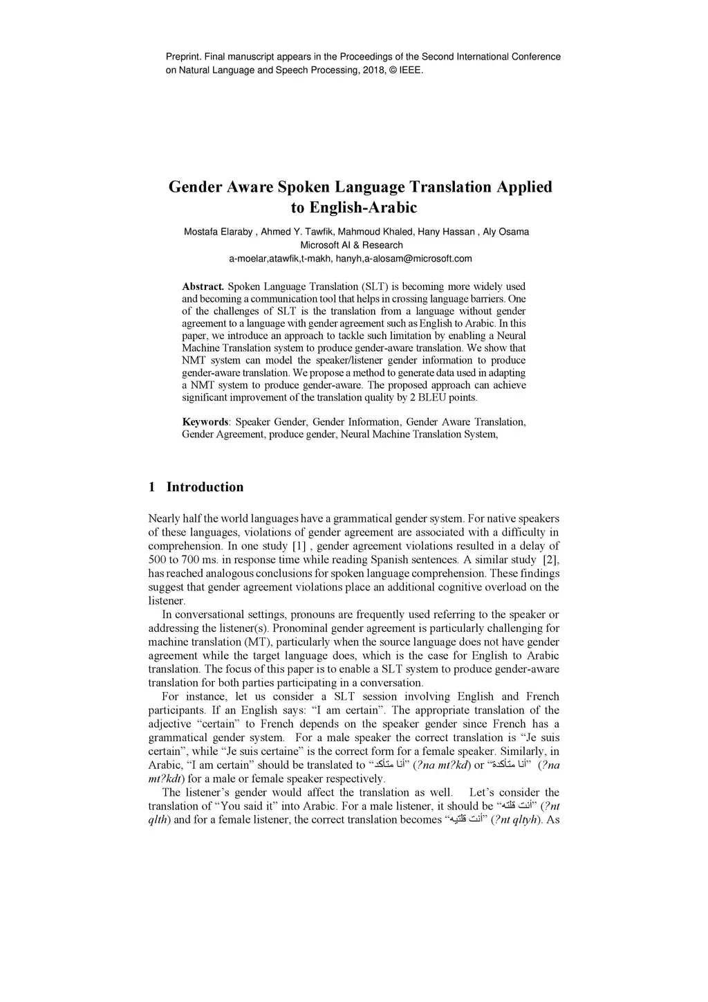 Gender Aware Spoken Language Translation Applied to English-Arabic