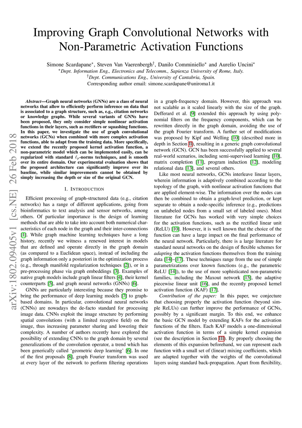 Graph neural networks (GNNs) are a class of neural networks that allow to efficiently perform inference on data that is associated to a graph structure, such as, e.g., citation networks or knowledge graphs. While several variants of GNNs have been proposed, they only consider simple nonlinear activation functions in their layers, such as rectifiers or squashing functions. In this paper, we investigate the use of graph convolutional networks (GCNs) when combined with more complex activation functions, able to adapt from the training data. More specifically, we extend the recently proposed kernel activation function, a non-parametric model which can be implemented easily, can be regularized with standard -norms techniques, and is smooth over its entire domain. Our experimental evaluation shows that the proposed architecture can significantly improve over its baseline, while similar improvements cannot be obtained by simply increasing the depth or size of the original GCN.