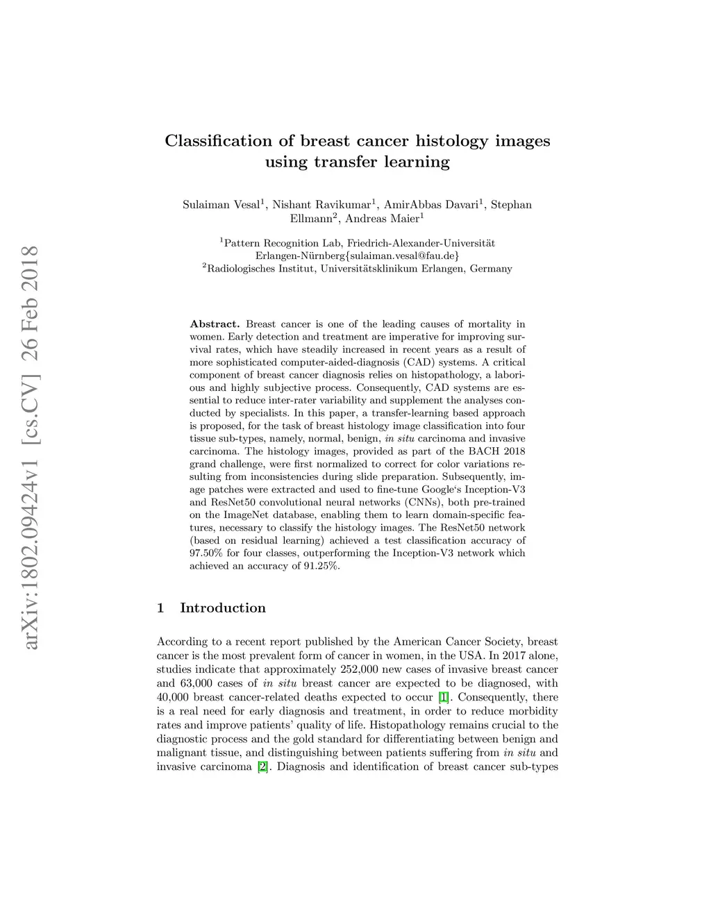 Breast cancer is one of the leading causes of mortality in women. Early detection and treatment are imperative for improving survival rates, which have steadily increased in recent years as a result of more sophisticated computer-aided-diagnosis (CAD) systems. A critical component of breast cancer diagnosis relies on histopathology, a laborious and highly subjective process. Consequently, CAD systems are essential to reduce inter-rater variability and supplement the analyses conducted by specialists. In this paper, a transfer-learning based approach is proposed, for the task of breast histology image classification into four tissue sub-types, namely, normal, benign, \textit{in situ} carcinoma and invasive carcinoma. The histology images, provided as part of the BACH 2018 grand challenge, were first normalized to correct for color variations resulting from inconsistencies during slide preparation. Subsequently, image patches were extracted and used to fine-tune Google`s Inception-V3 and ResNet50 convolutional neural networks (CNNs), both pre-trained on the ImageNet database, enabling them to learn domain-specific features, necessary to classify the histology images. The ResNet50 network (based on residual learning) achieved a test classification accuracy of 97.50% for four classes, outperforming the Inception-V3 network which achieved an accuracy of 91.25%.