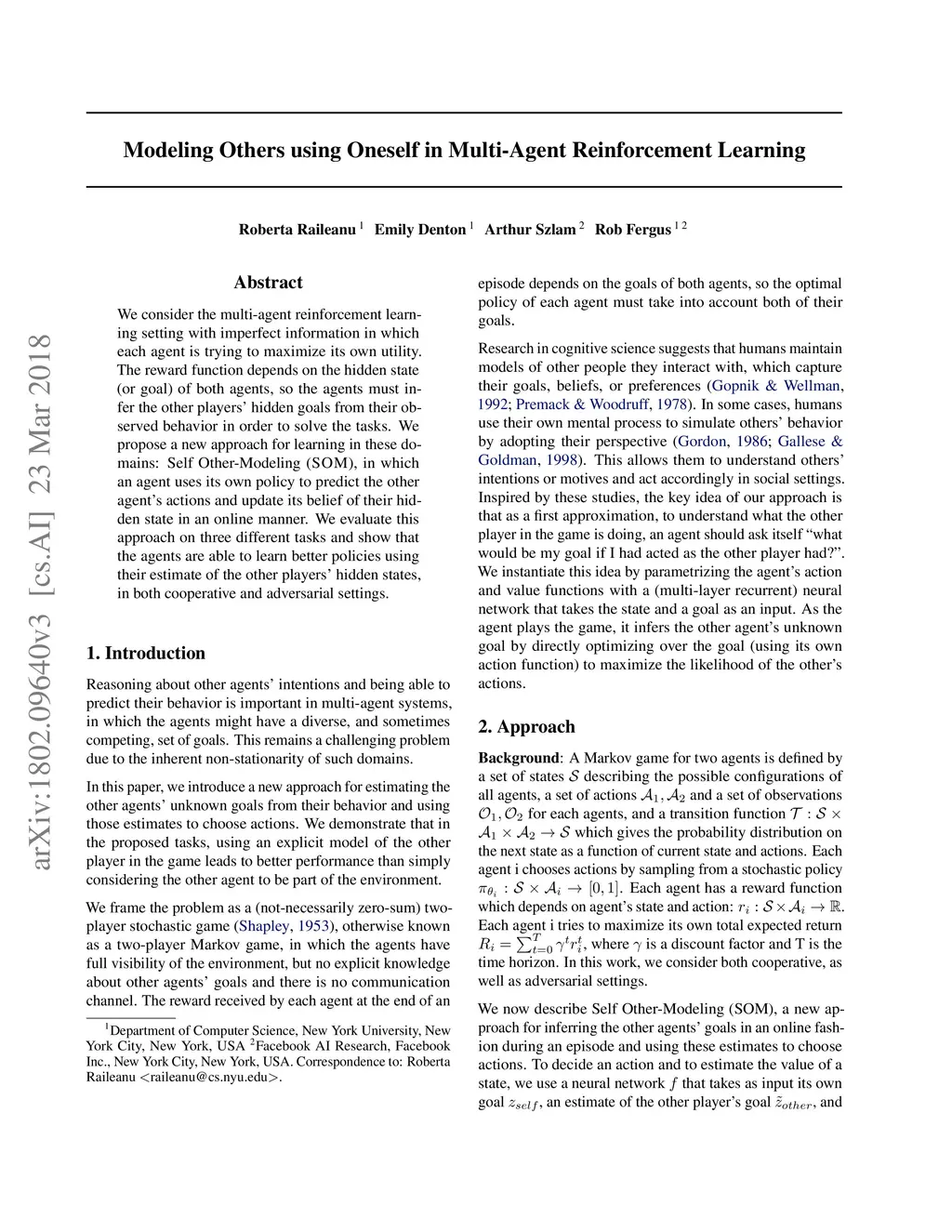 We consider the multi-agent reinforcement learning setting with imperfect information in which each agent is trying to maximize its own utility. The reward function depends on the hidden state (or goal) of both agents, so the agents must infer the other players' hidden goals from their observed behavior in order to solve the tasks. We propose a new approach for learning in these domains: Self Other-Modeling (SOM), in which an agent uses its own policy to predict the other agent's actions and update its belief of their hidden state in an online manner. We evaluate this approach on three different tasks and show that the agents are able to learn better policies using their estimate of the other players' hidden states, in both cooperative and adversarial settings.
