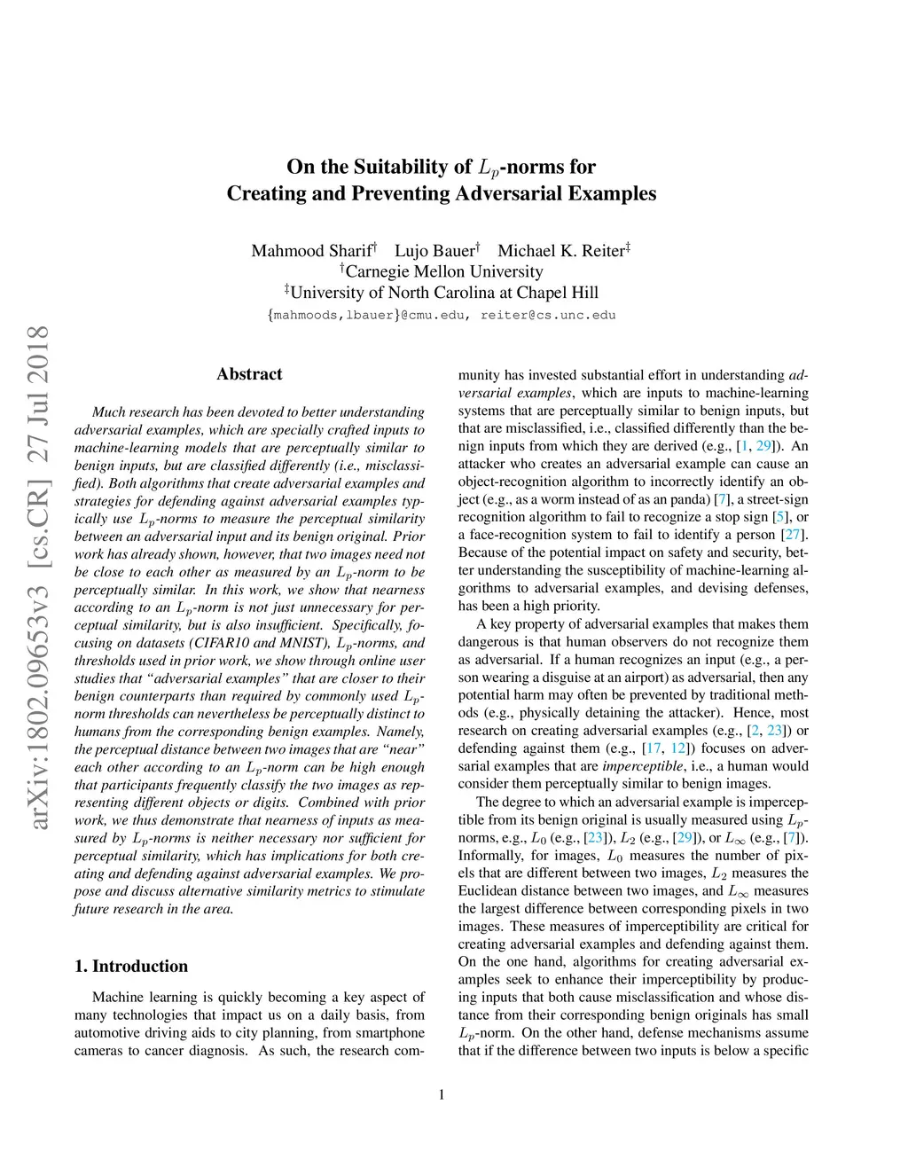 Much research effort has been devoted to better understanding adversarial examples, which are specially crafted inputs to machine-learning models that are perceptually similar to benign inputs, but are classified differently (i.e., misclassified). Both algorithms that create adversarial examples and strategies for defending against them typically use -norms to measure the perceptual similarity between an adversarial input and its benign original. Prior work has already shown, however, that two images need not be close to each other as measured by an -norm to be perceptually similar. In this work, we show that nearness according to an -norm is not just unnecessary for perceptual similarity, but is also insufficient. Specifically, focusing on datasets (CIFAR10 and MNIST), -norms, and thresholds used in prior work, we show through online user studies that "adversarial examples" that are closer to their benign counterparts than required by commonly used -norm thresholds can nevertheless be perceptually different to humans from the corresponding benign examples. Namely, the perceptual distance between two images that are "near" each other according to an -norm can be high enough that participants frequently classify the two images as representing different objects or digits. Combined with prior work, we thus demonstrate that nearness of inputs as measured by -norms is neither necessary nor sufficient for perceptual similarity, which has implications for both creating and defending against adversarial examples. We propose and discuss alternative similarity metrics to stimulate future research in the area.