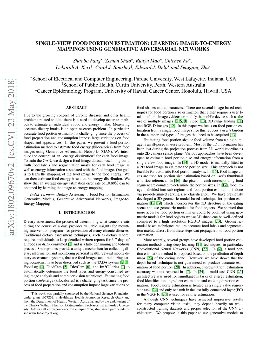 Due to the growing concern of chronic diseases and other health problems related to diet, there is a need to develop accurate methods to estimate an individual's food and energy intake. Measuring accurate dietary intake is an open research problem. In particular, accurate food portion estimation is challenging since the process of food preparation and consumption impose large variations on food shapes and appearances. In this paper, we present a food portion estimation method to estimate food energy (kilocalories) from food images using Generative Adversarial Networks (GAN). We introduce the concept of an "energy distribution" for each food image. To train the GAN, we design a food image dataset based on ground truth food labels and segmentation masks for each food image as well as energy information associated with the food image. Our goal is to learn the mapping of the food image to the food energy. We can then estimate food energy based on the energy distribution. We show that an average energy estimation error rate of 10.89% can be obtained by learning the image-to-energy mapping.