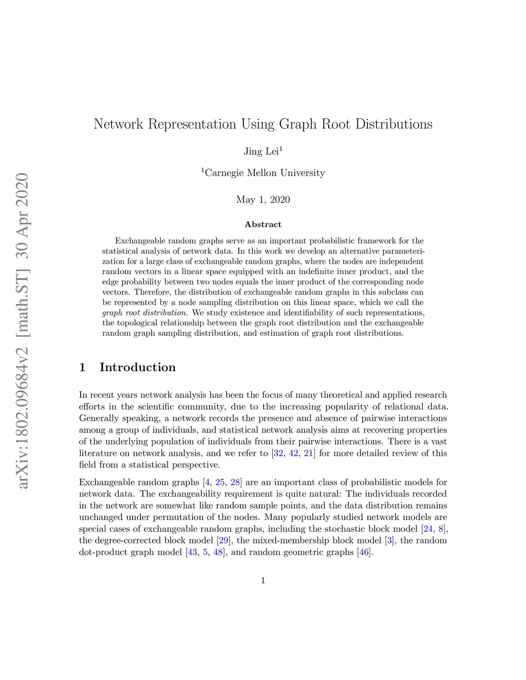 Exchangeable random graphs serve as an important probabilistic framework for the statistical analysis of network data. In this work we develop an alternative parameterization for a large class of exchangeable random graphs, where the nodes are independent random vectors in a linear space equipped with an indefinite inner product, and the edge probability between two nodes equals the inner product of the corresponding node vectors. Therefore, the distribution of exchangeable random graphs in this subclass can be represented by a node sampling distribution on this linear space, which we call the graph root distribution. We study existence and identifiability of such representations, the topological relationship between the graph root distribution and the exchangeable random graph sampling distribution, and estimation of graph root distributions.
