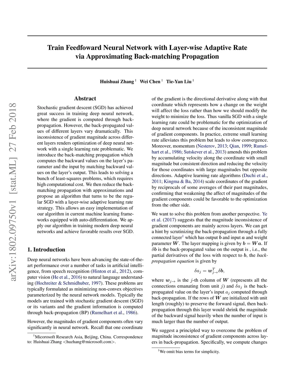 Stochastic gradient descent (SGD) has achieved great success in training deep neural network, where the gradient is computed through back-propagation. However, the back-propagated values of different layers vary dramatically. This inconsistence of gradient magnitude across different layers renders optimization of deep neural network with a single learning rate problematic. We introduce the back-matching propagation which computes the backward values on the layer's parameter and the input by matching backward values on the layer's output. This leads to solving a bunch of least-squares problems, which requires high computational cost. We then reduce the back-matching propagation with approximations and propose an algorithm that turns to be the regular SGD with a layer-wise adaptive learning rate strategy. This allows an easy implementation of our algorithm in current machine learning frameworks equipped with auto-differentiation. We apply our algorithm in training modern deep neural networks and achieve favorable results over SGD.